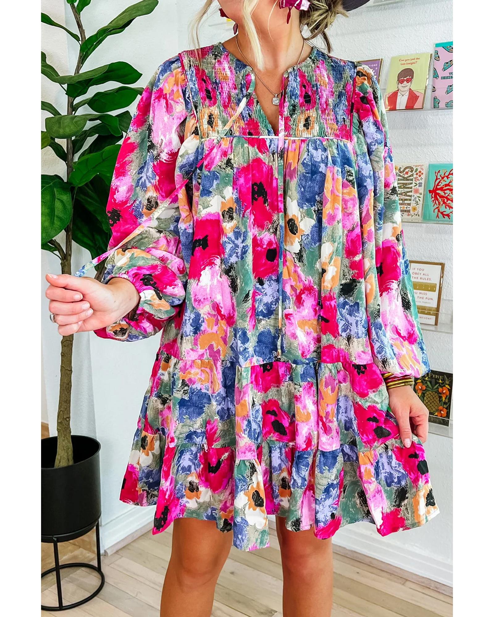 Multicolour Floral Tie Neck Bubble Sleeve Shift Dress - M