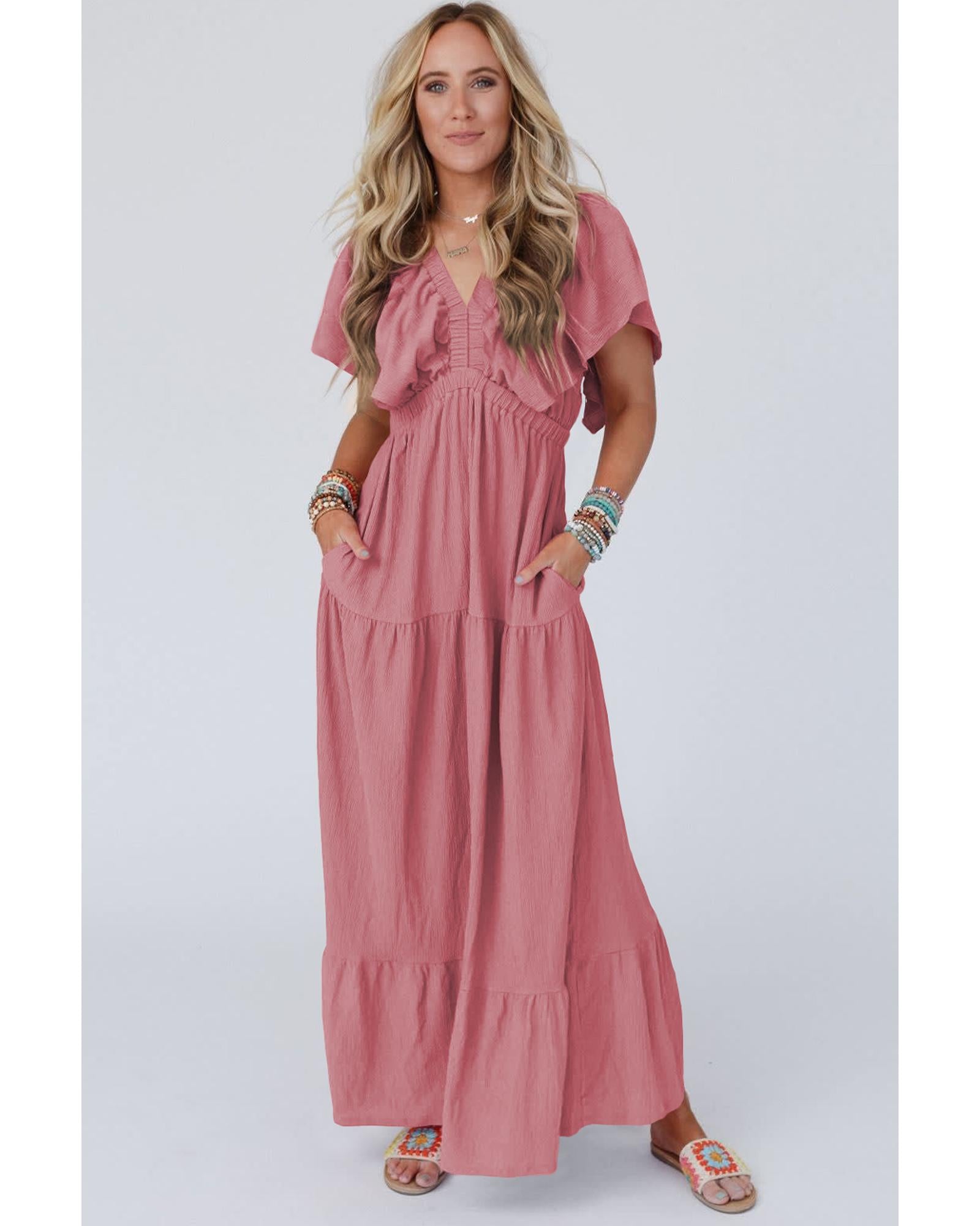 Rose Pink Textured V Neck Flutter Sleeve Ruffled Maxi Dress - XL