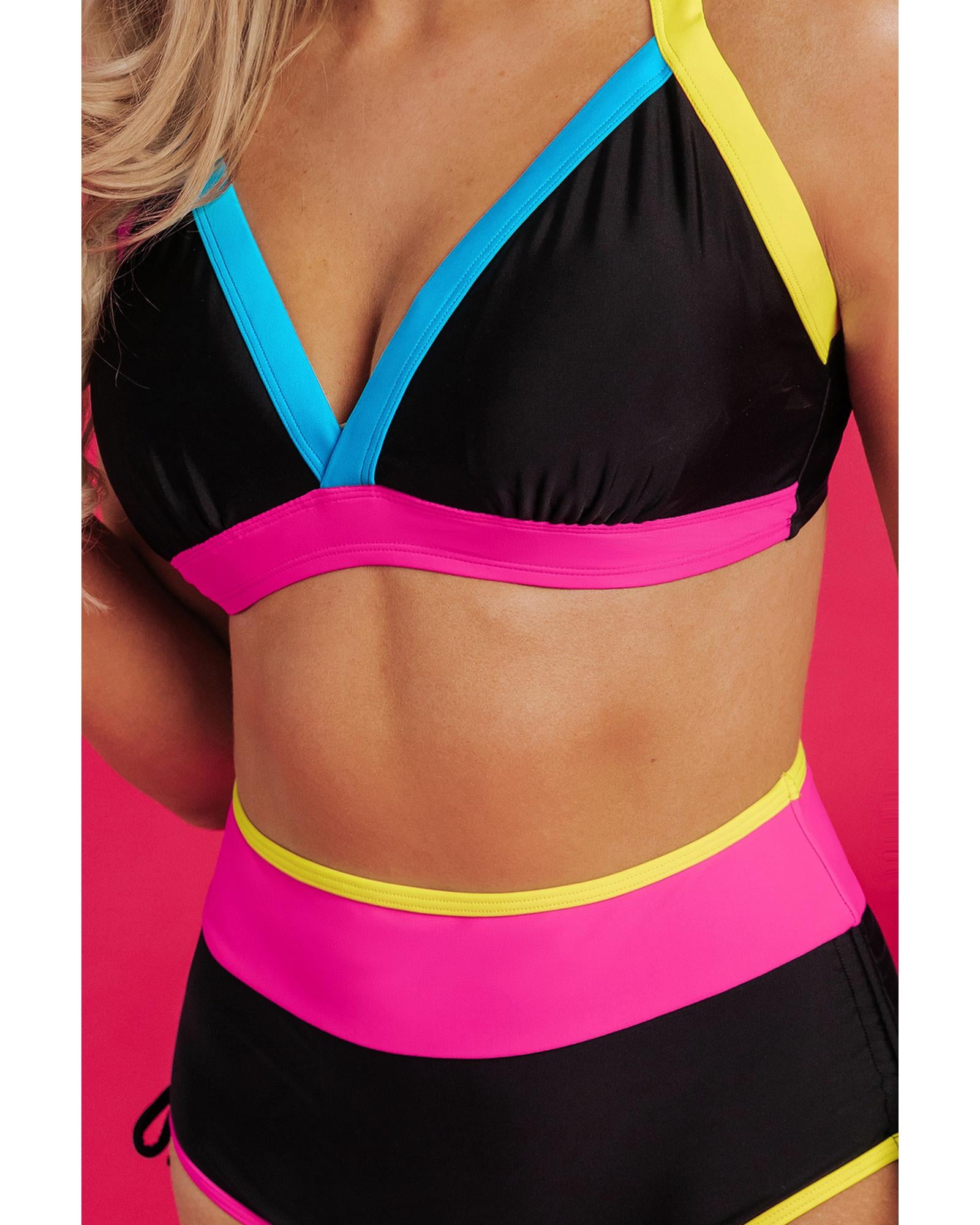 Black Color Block Drawstring Side V Neck High Waist Bikini Set - M