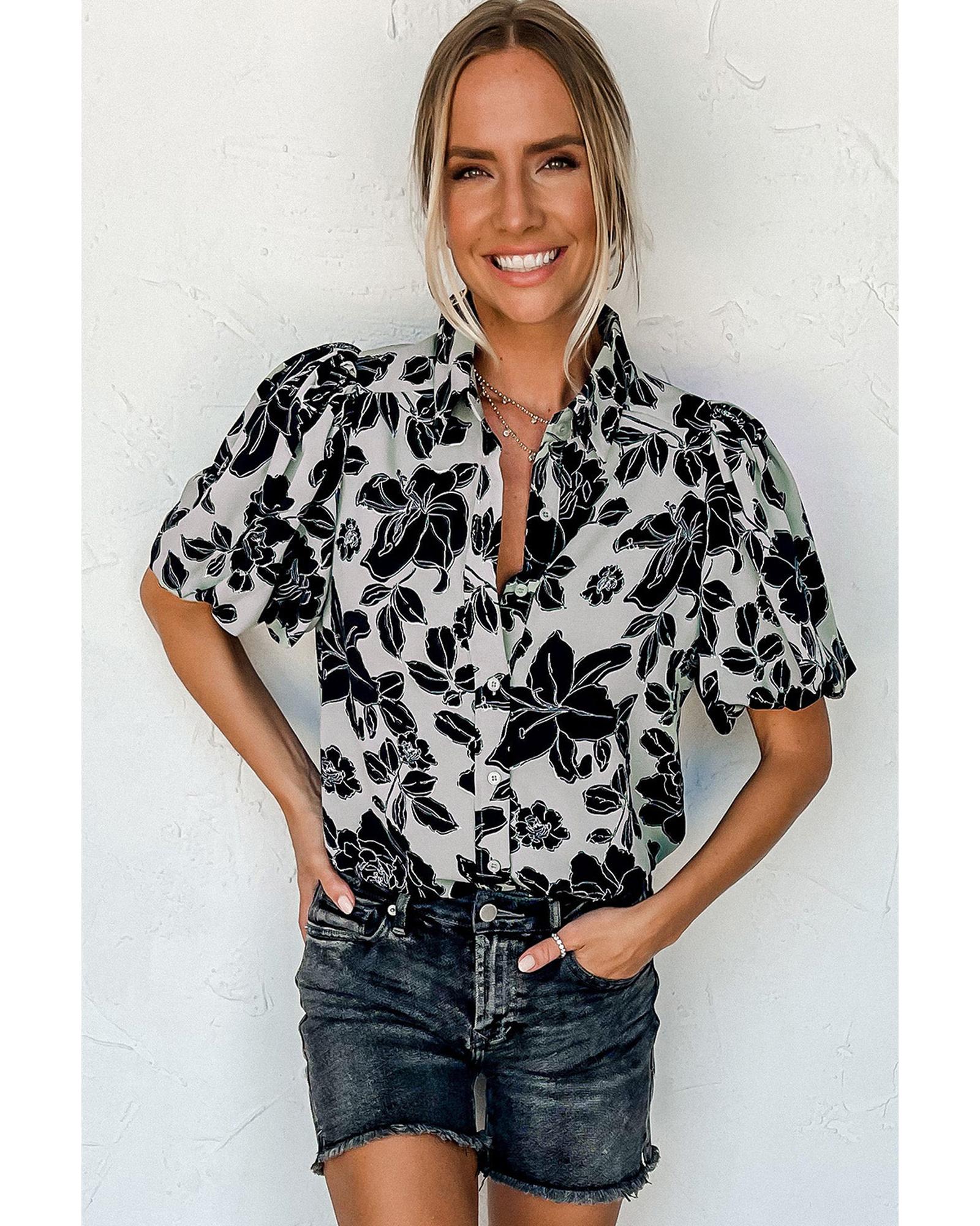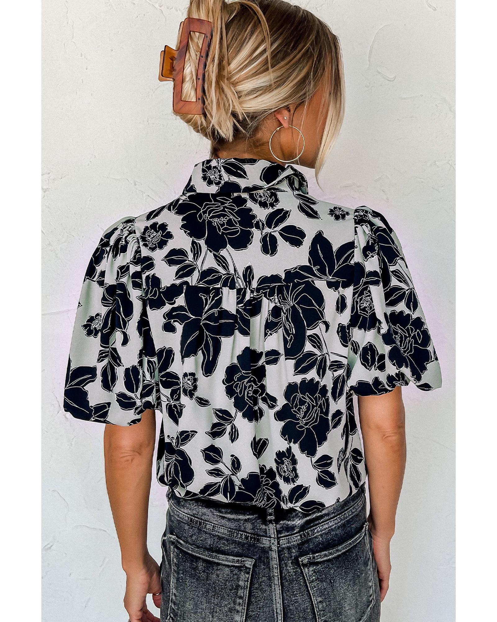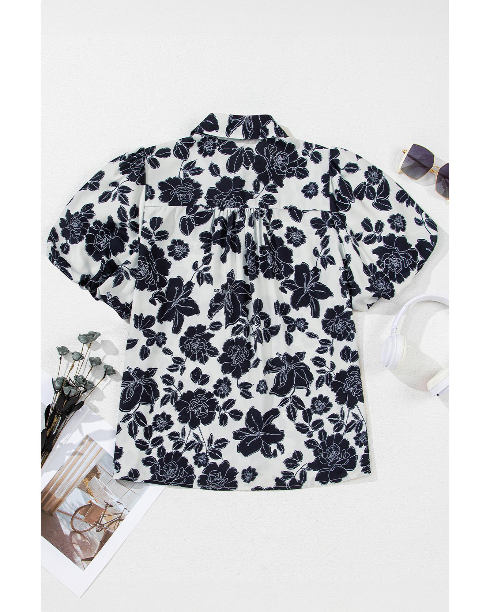 Black Floral Bubble Sleeve Casual Shirt - L