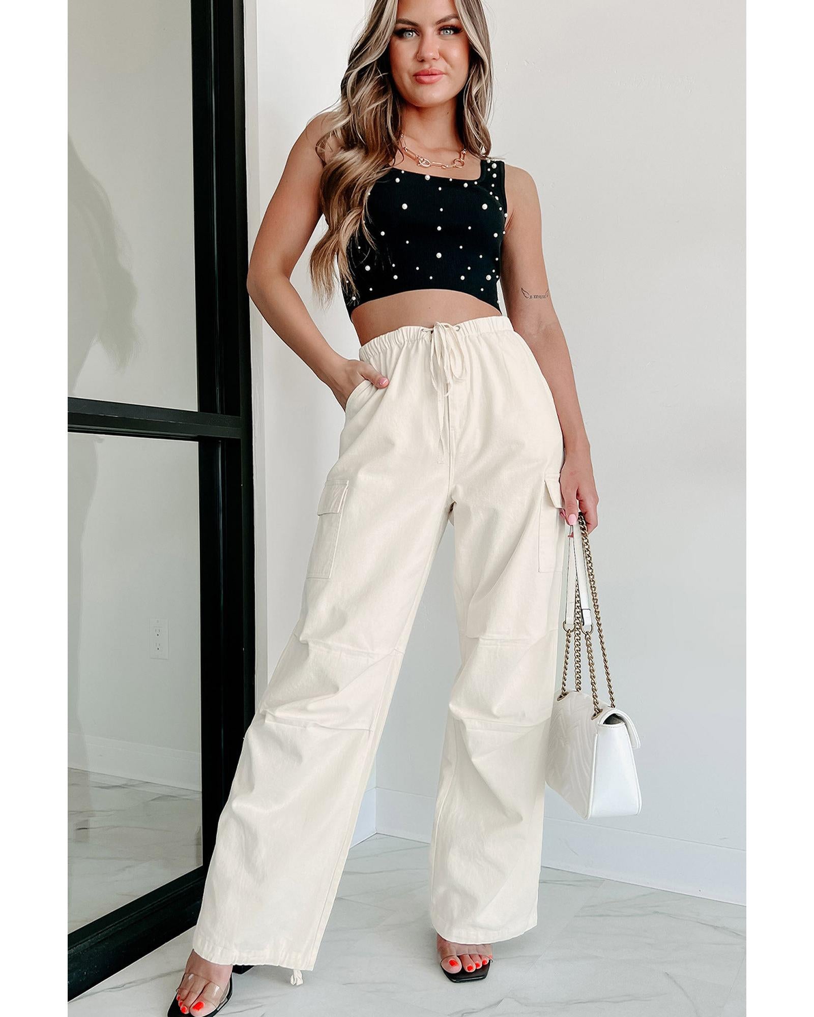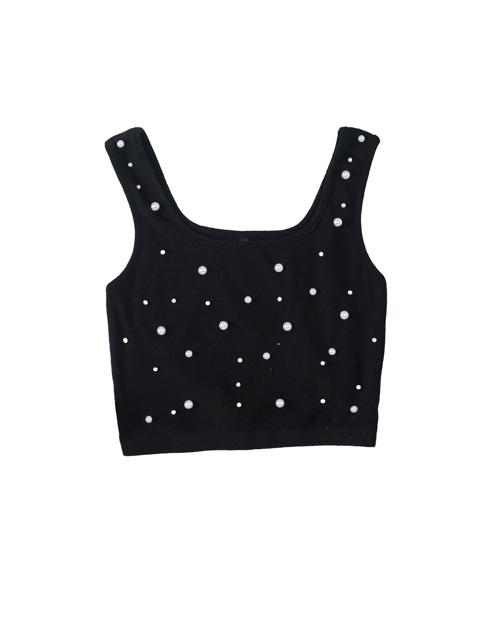 Black Pearl Decor Square Neck Sleeveless Crop Top - L
