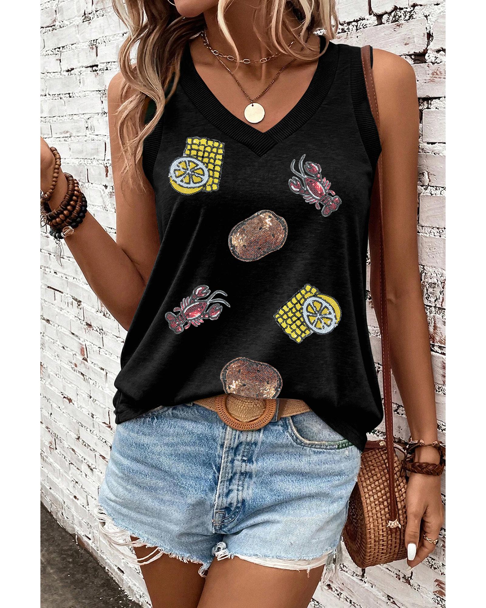 Black Sequined Crawfish Ribbed V Neckline Tank Top - XL
