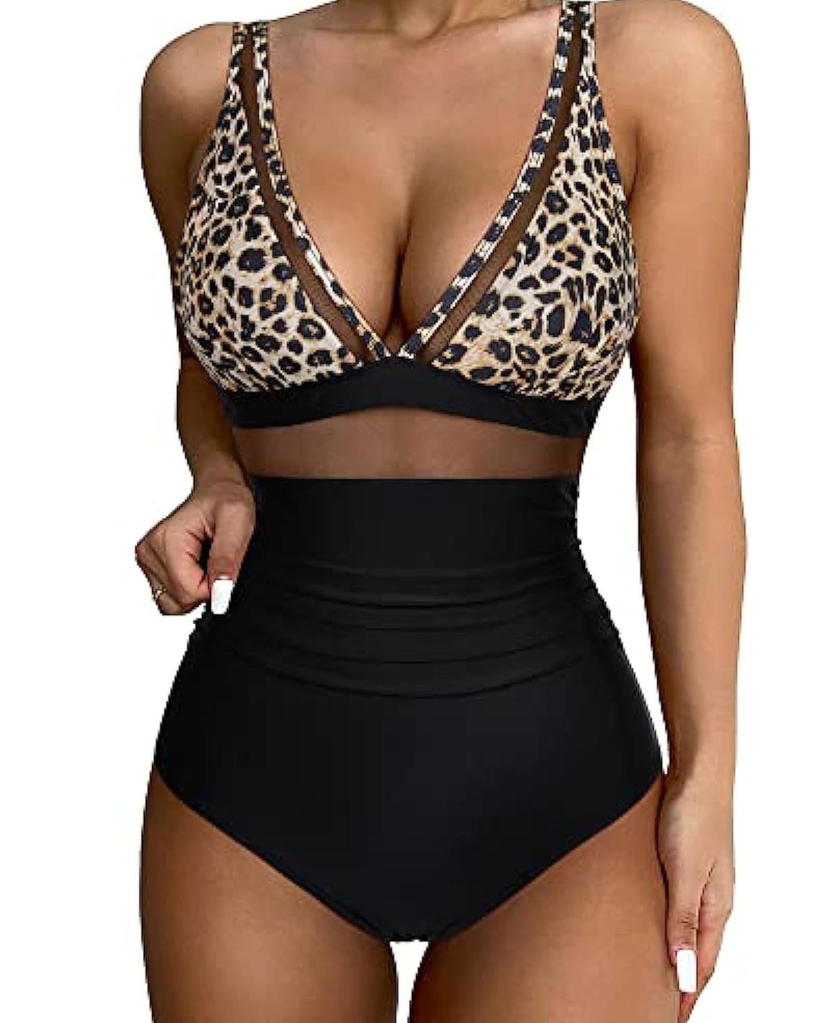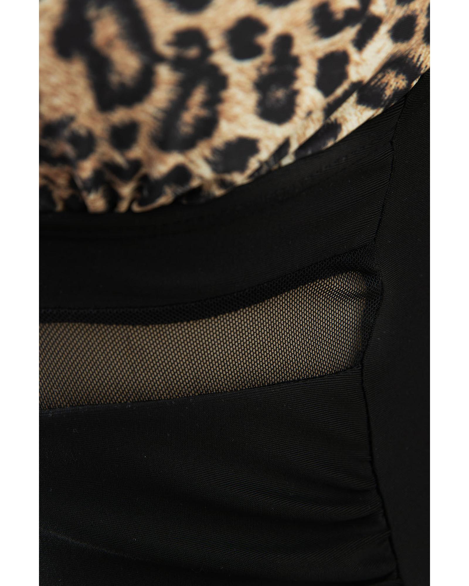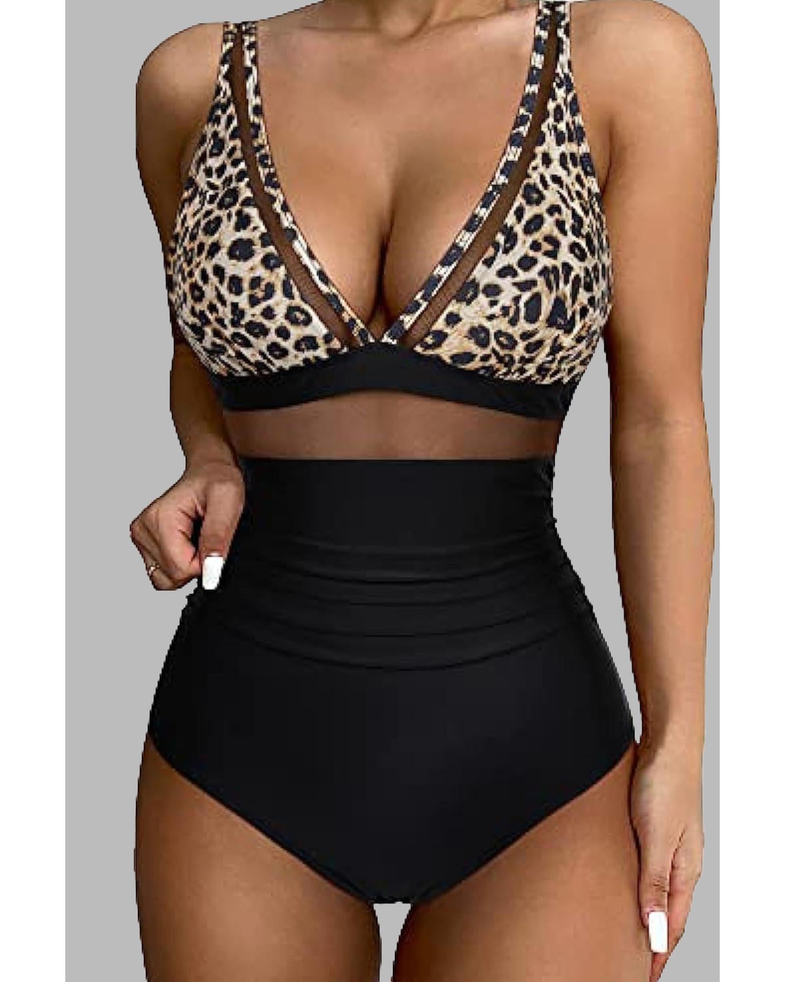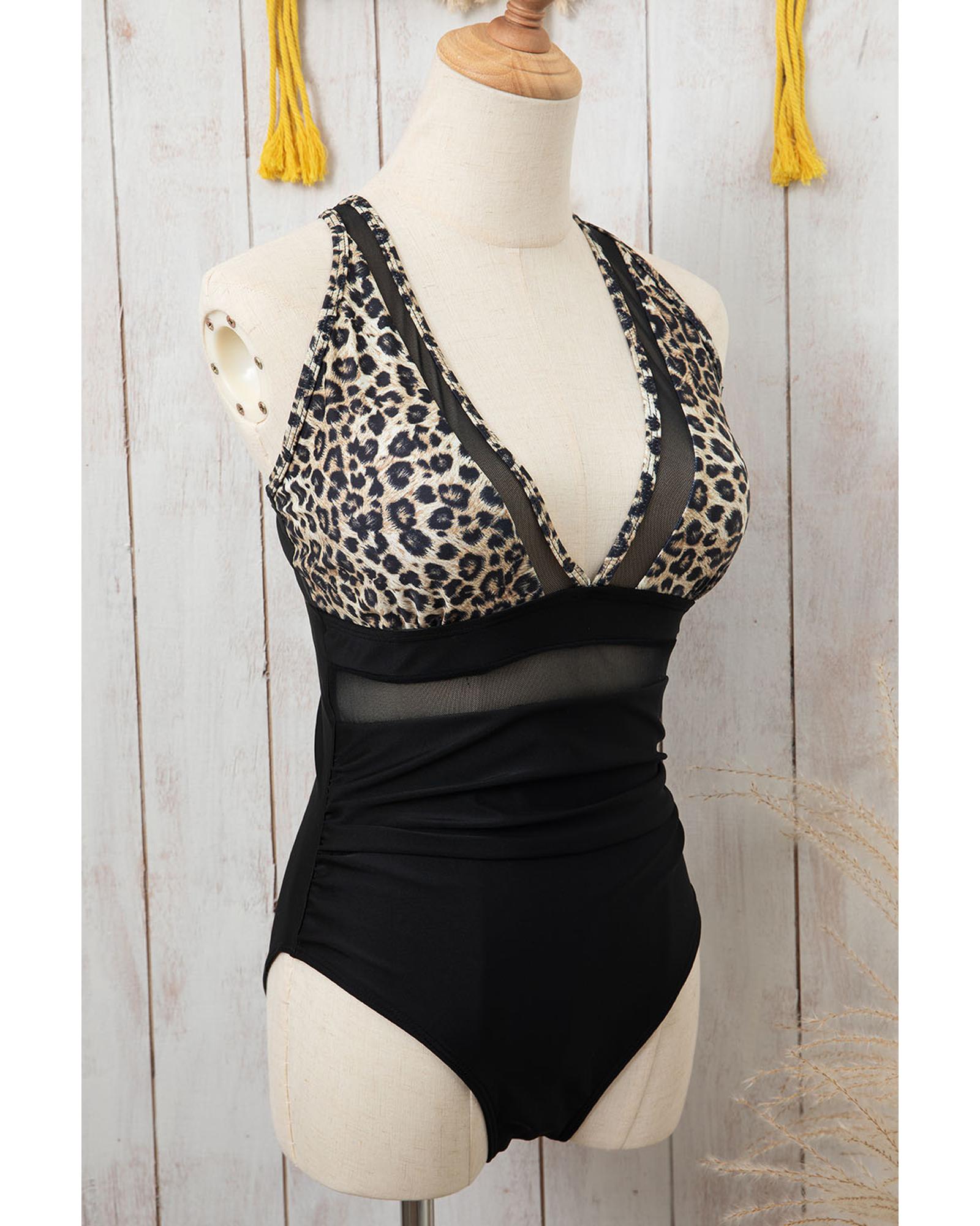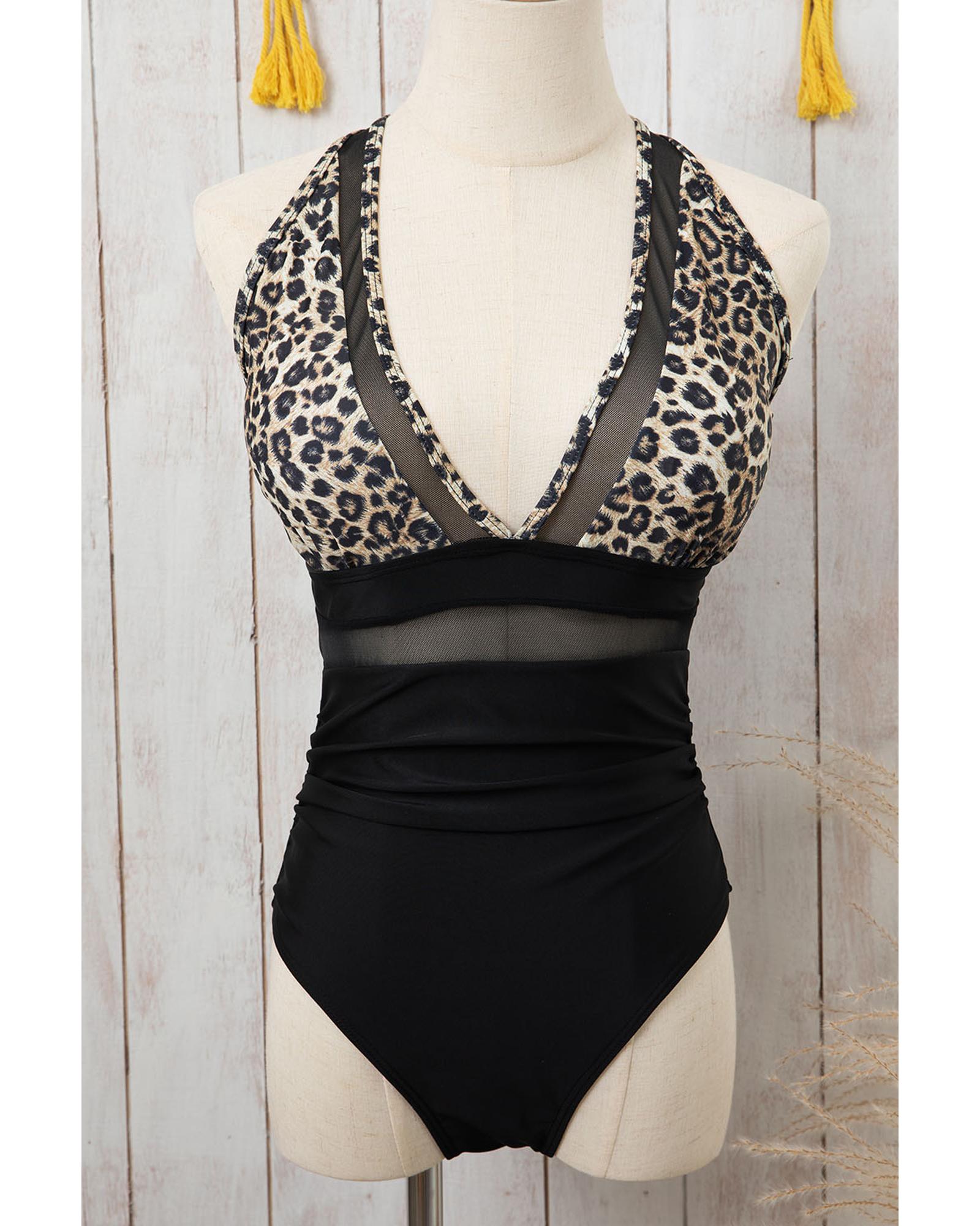 Brown Leopard Mesh Insert V Neck High Waist Monokini - S