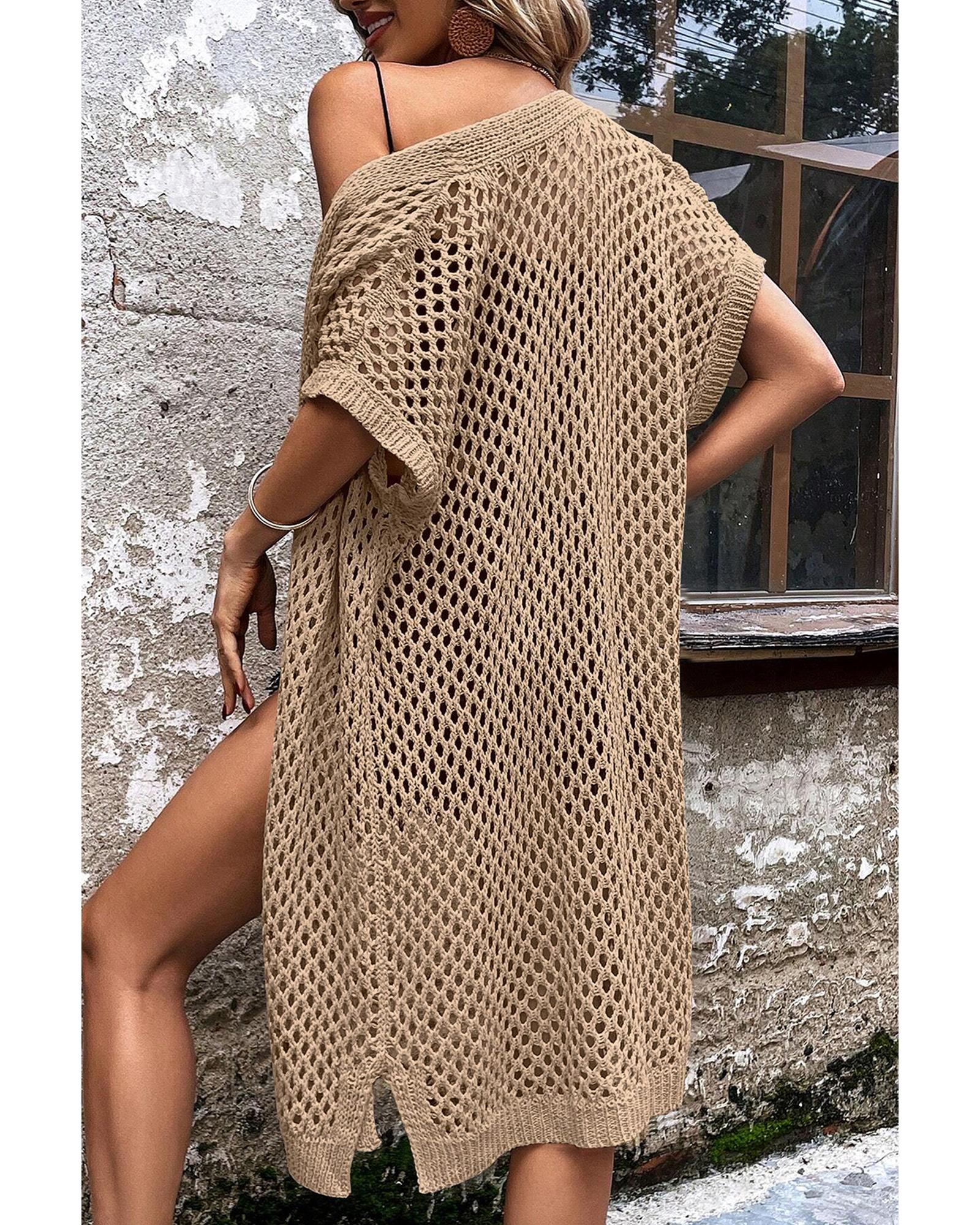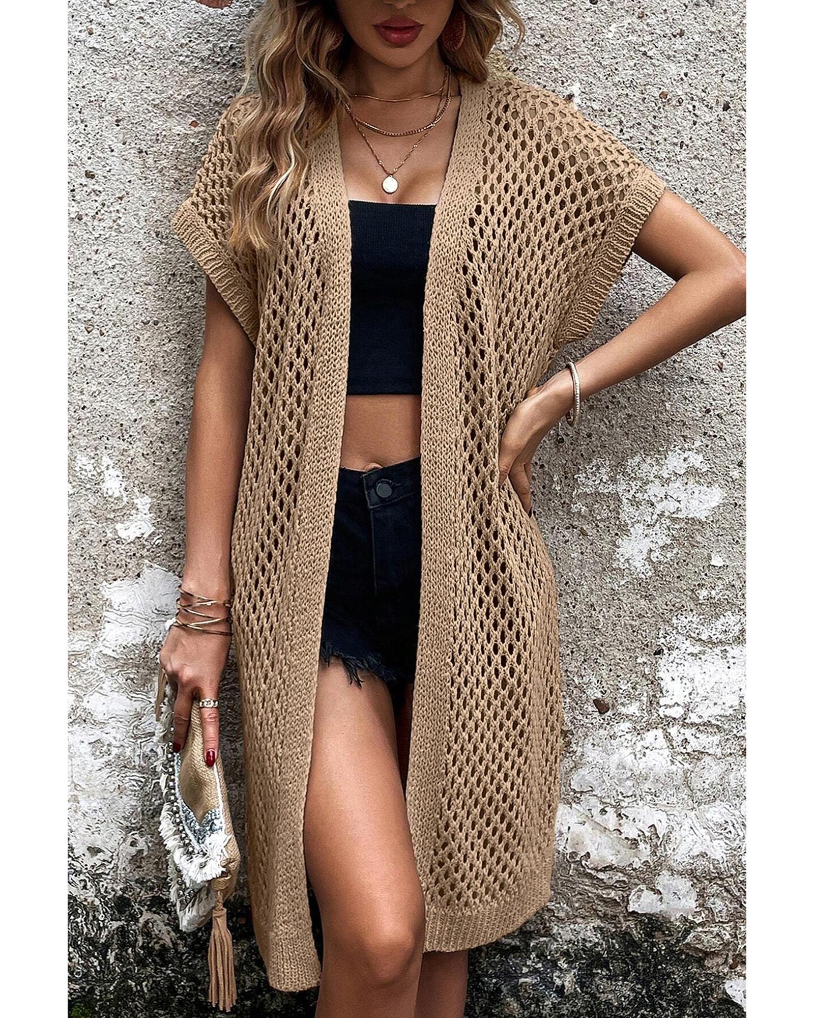 Camel Batwing Sleeve Pointelle Knit Open Front Cardigan - S