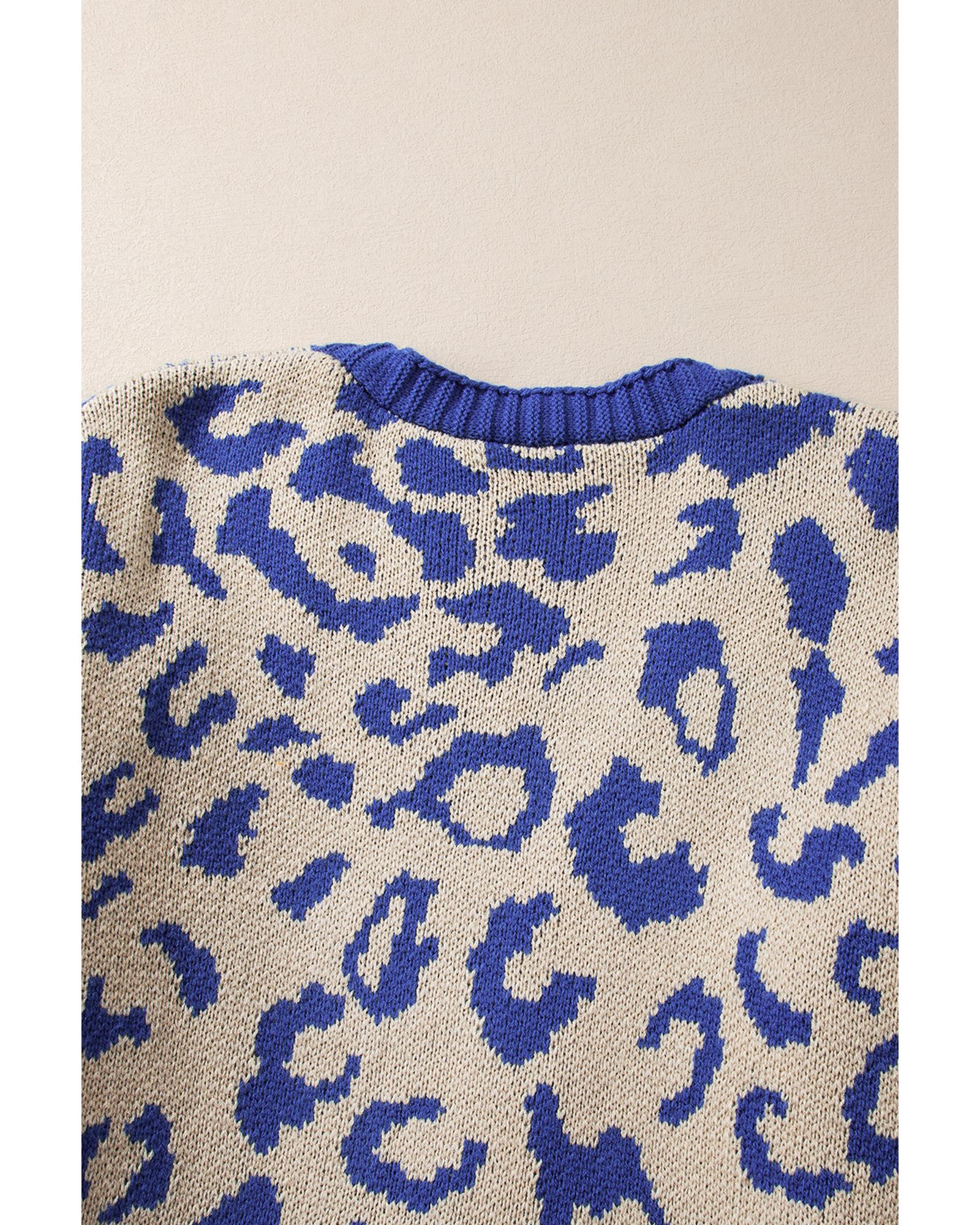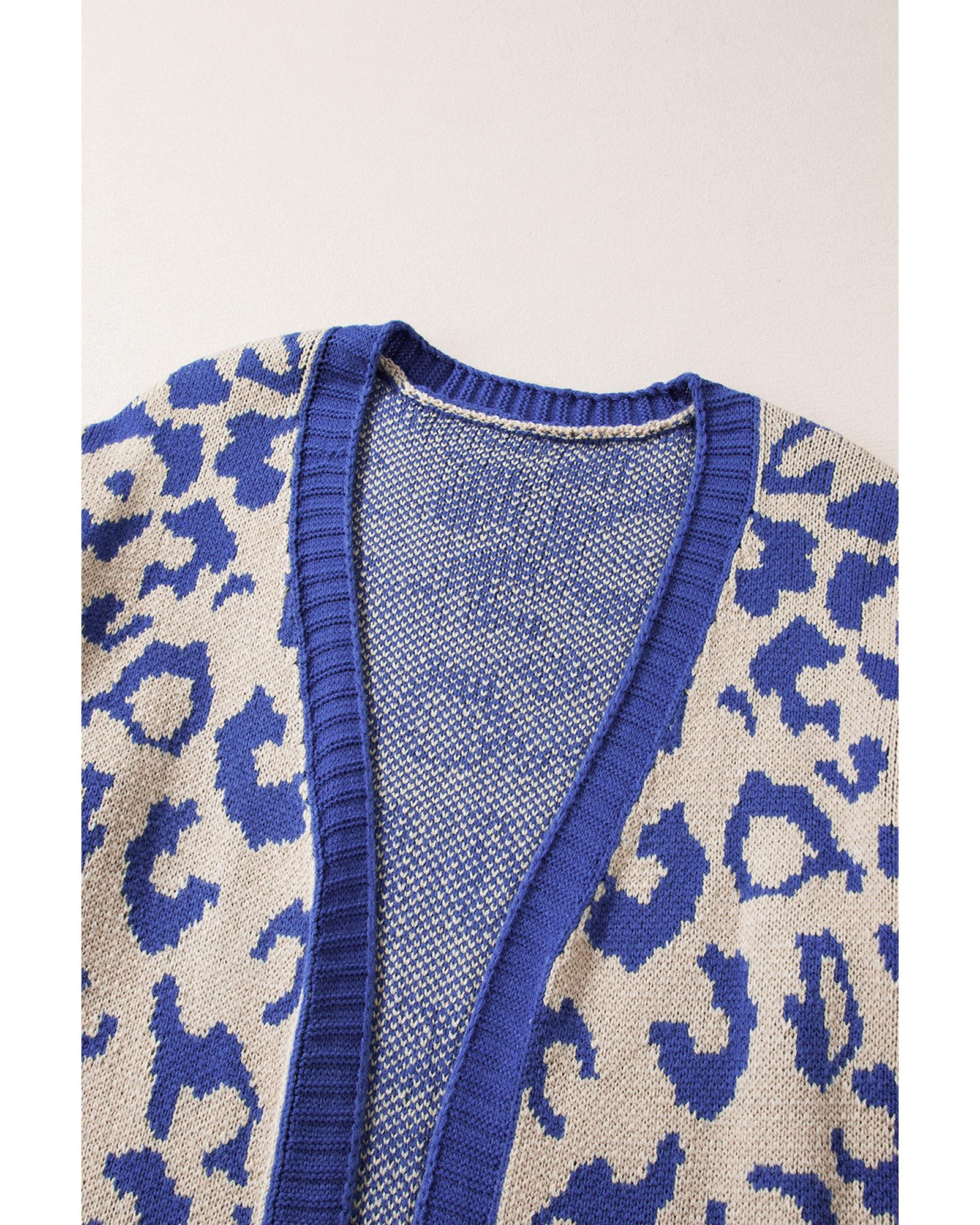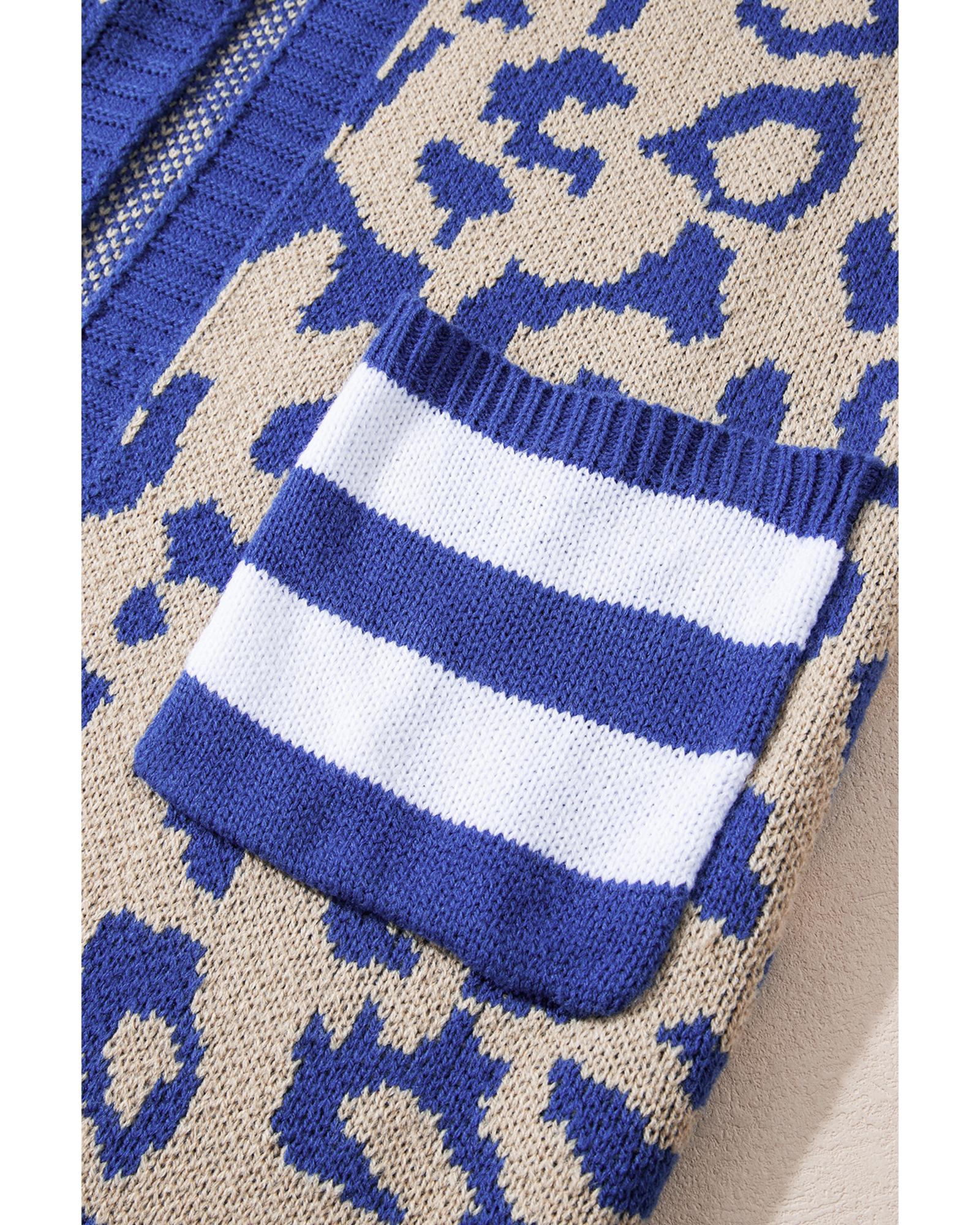 Dark Blue Stripe Sleeve Leopard Print Open Front Cardigan With Pockets - L