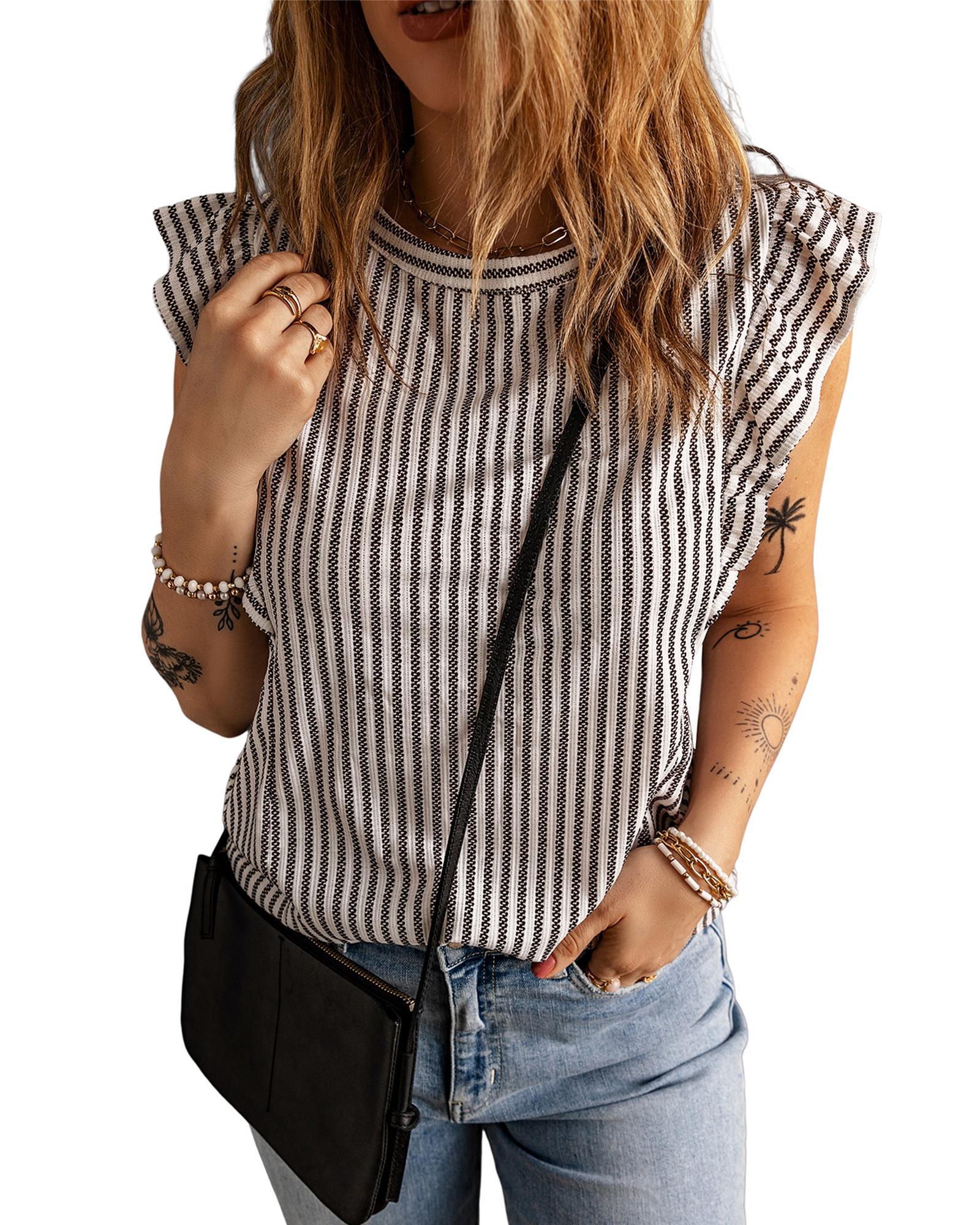 Gray Crew Neck Ruffled Striped Tank Top - S
