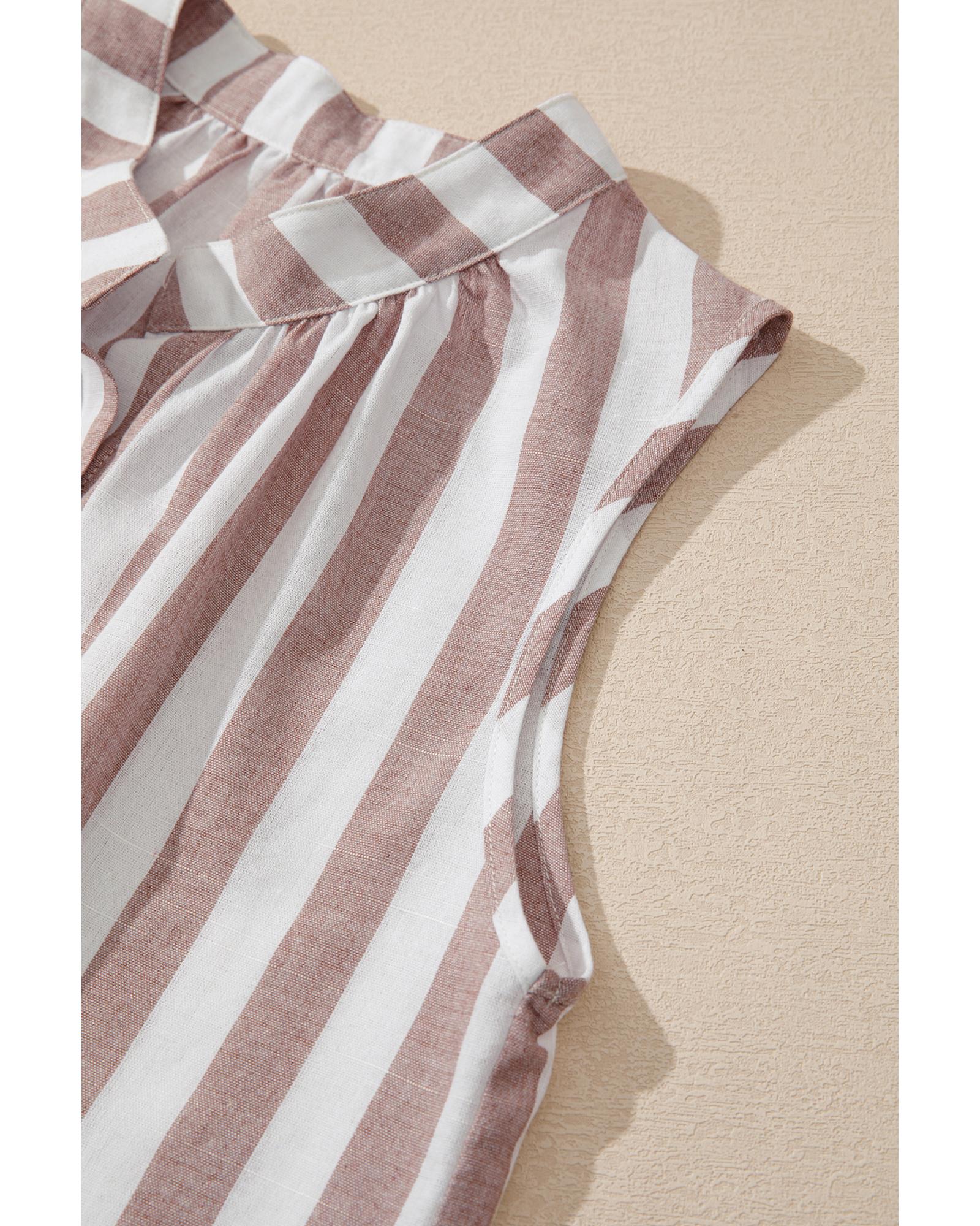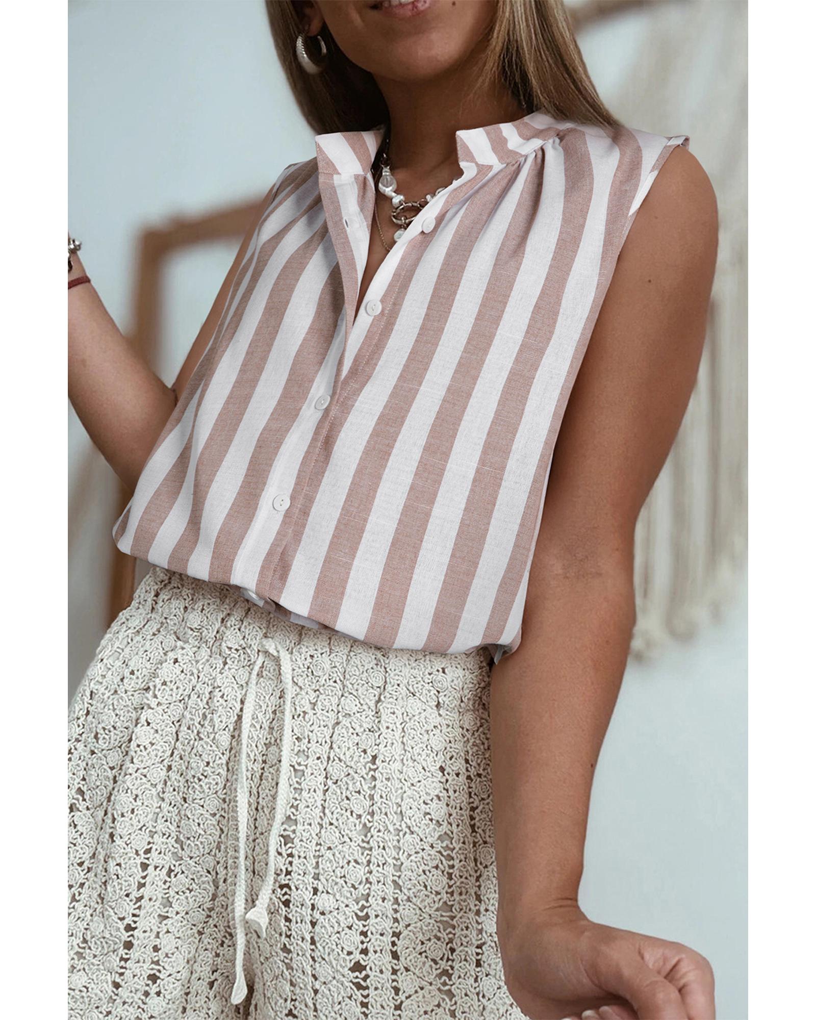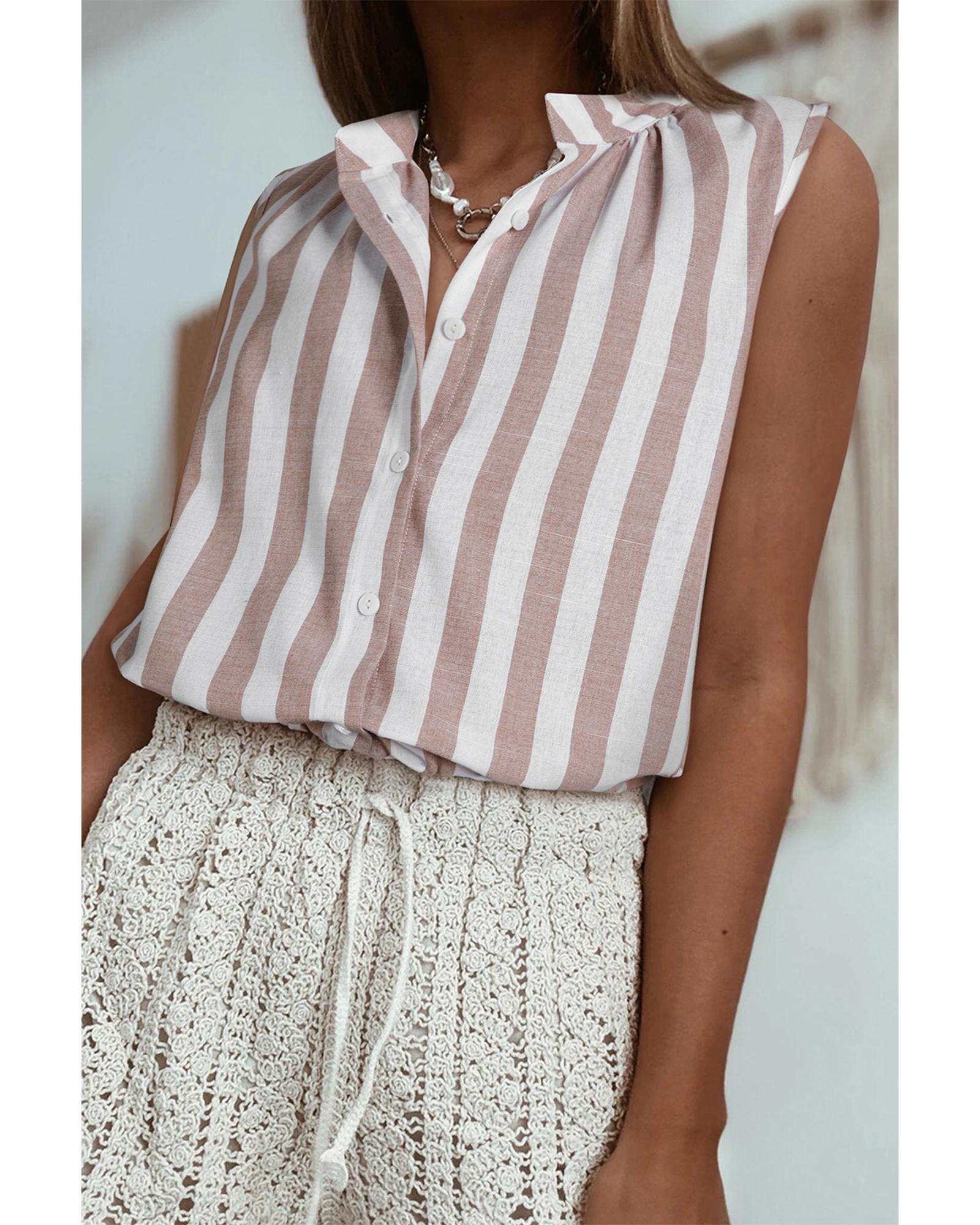Khaki Stripe Casual Button Down Sleeveless Shirt - S