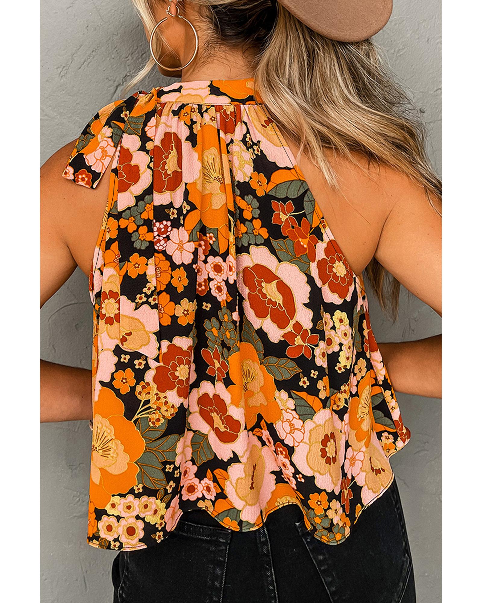 Orange Floral Print Knotted Halter Neck Sleeveless Top - M