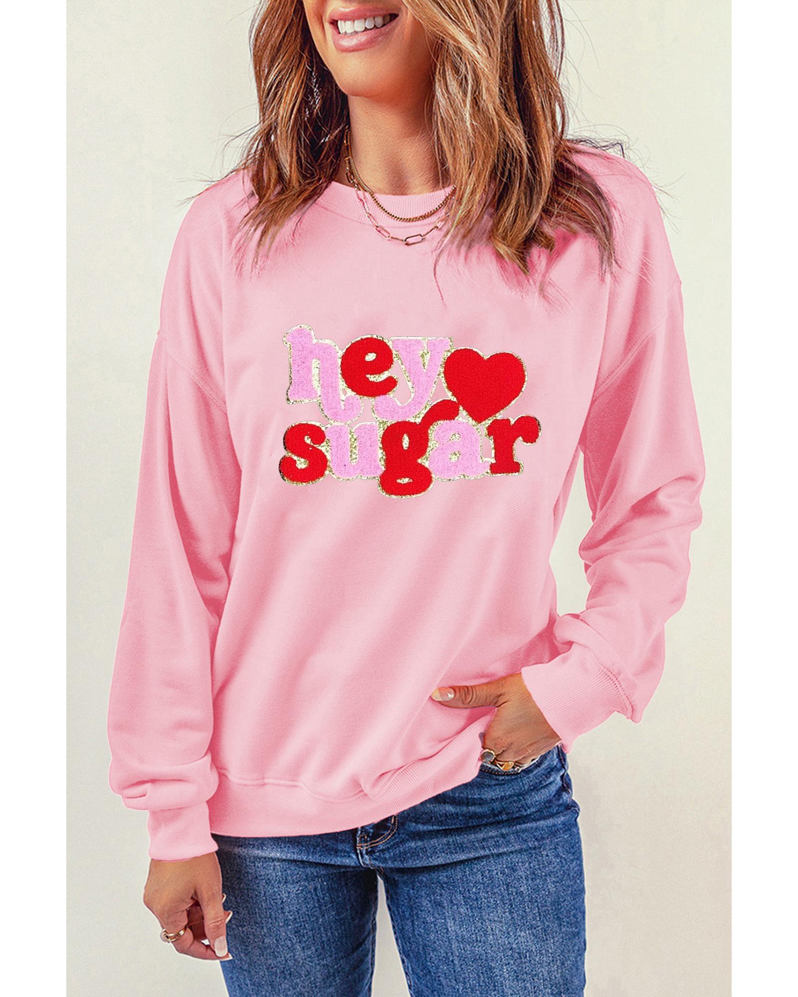 Pink Chenille Heart hey sugar Patched Pattern Valentines Pullover Sweatshirt - 2XL