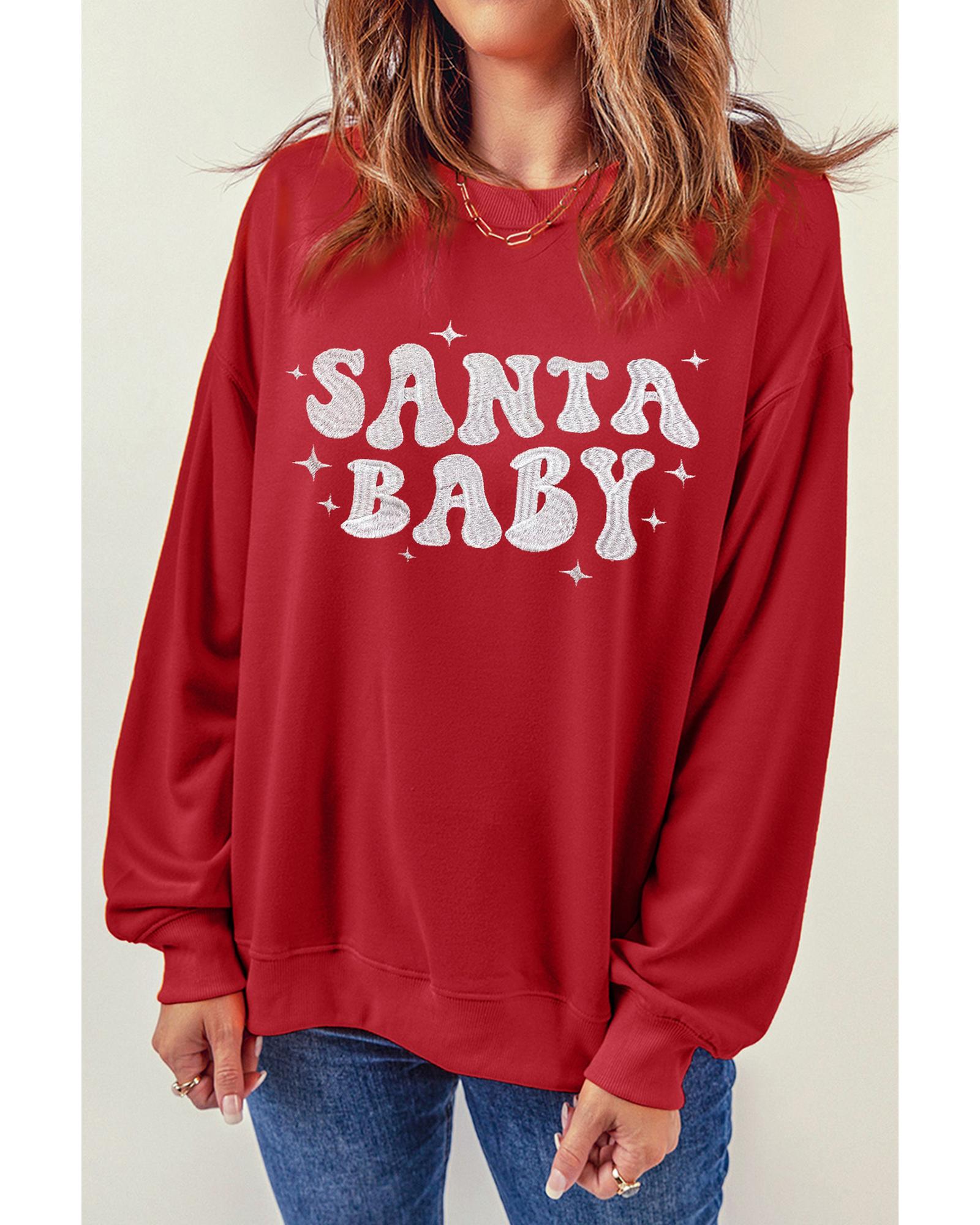 Red SANTA BABY Embroidered Crewneck Christmas Sweatshirt - L