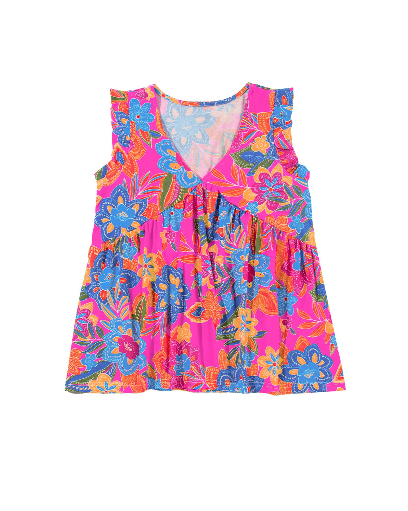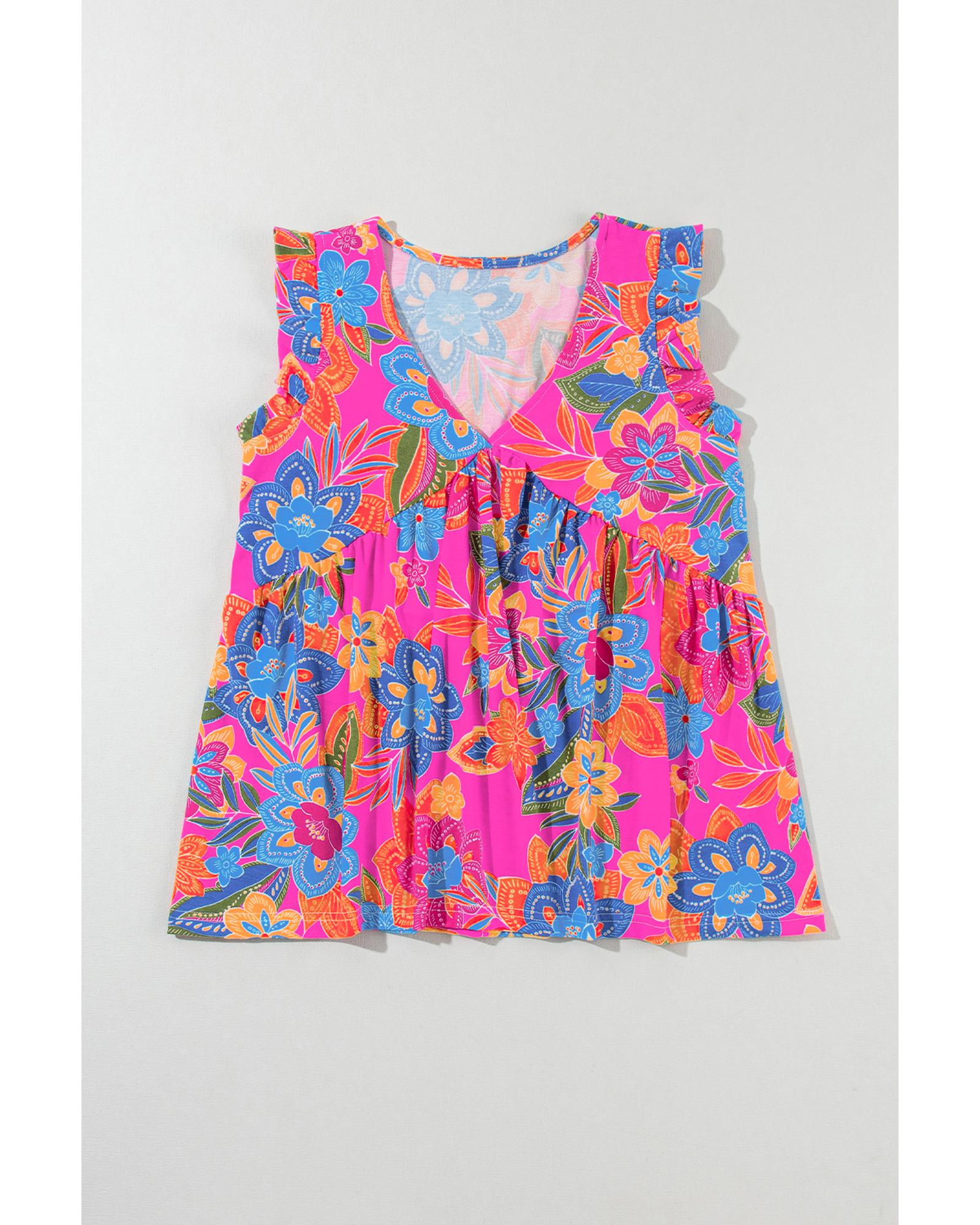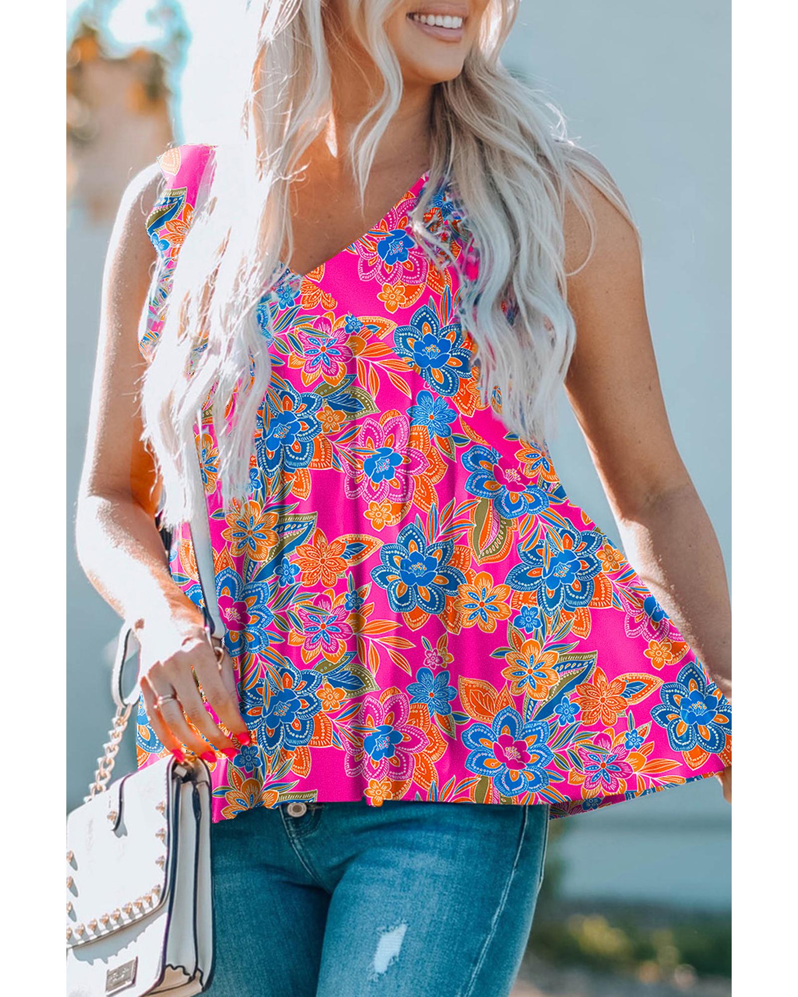 Rose Red Boho Pattern Print Flounce V Neck Tank Top - L
