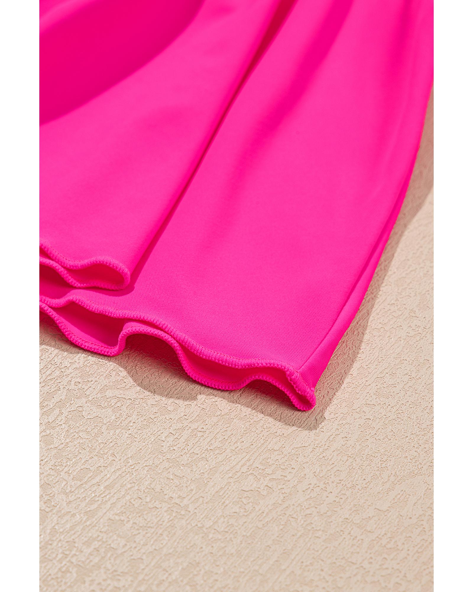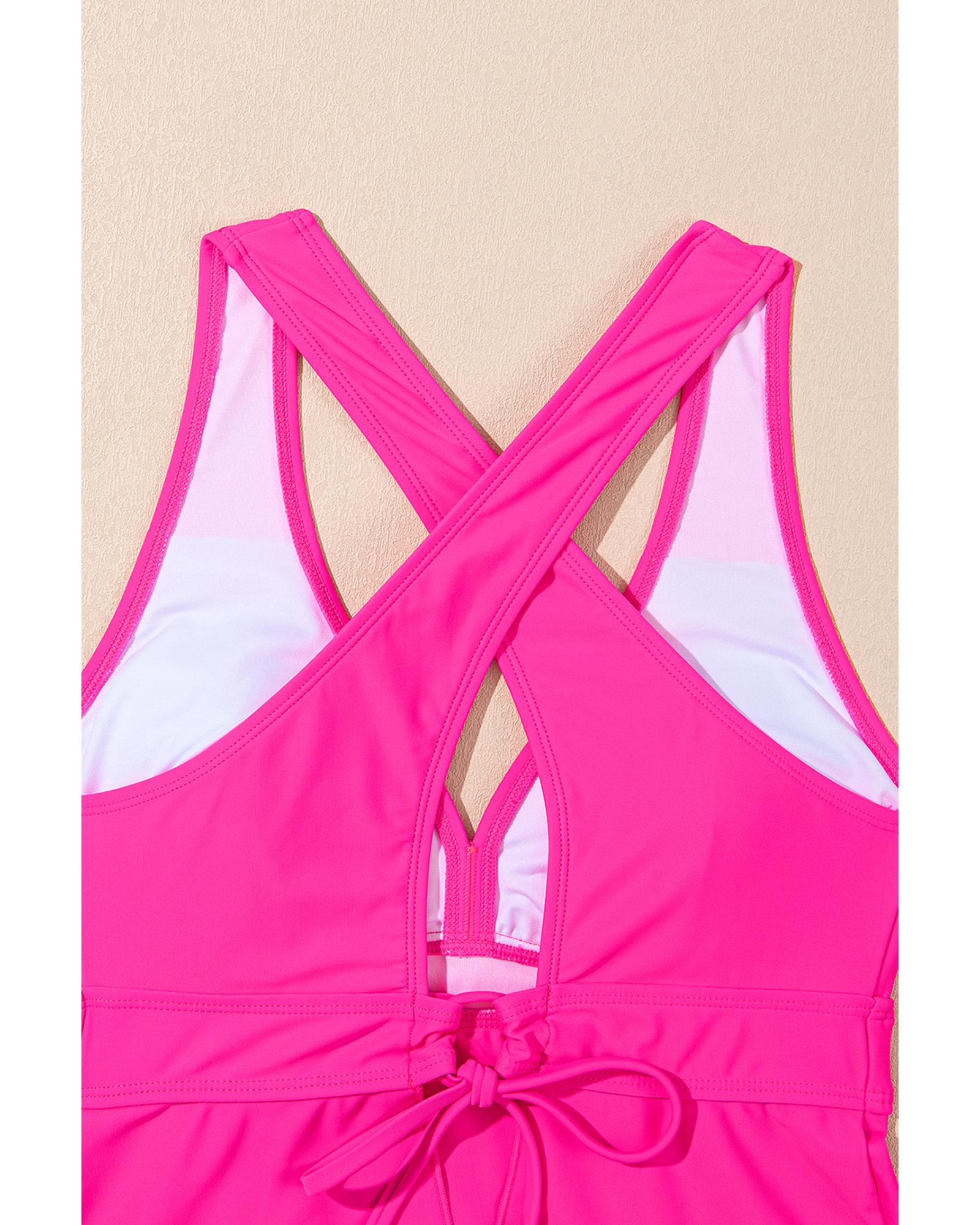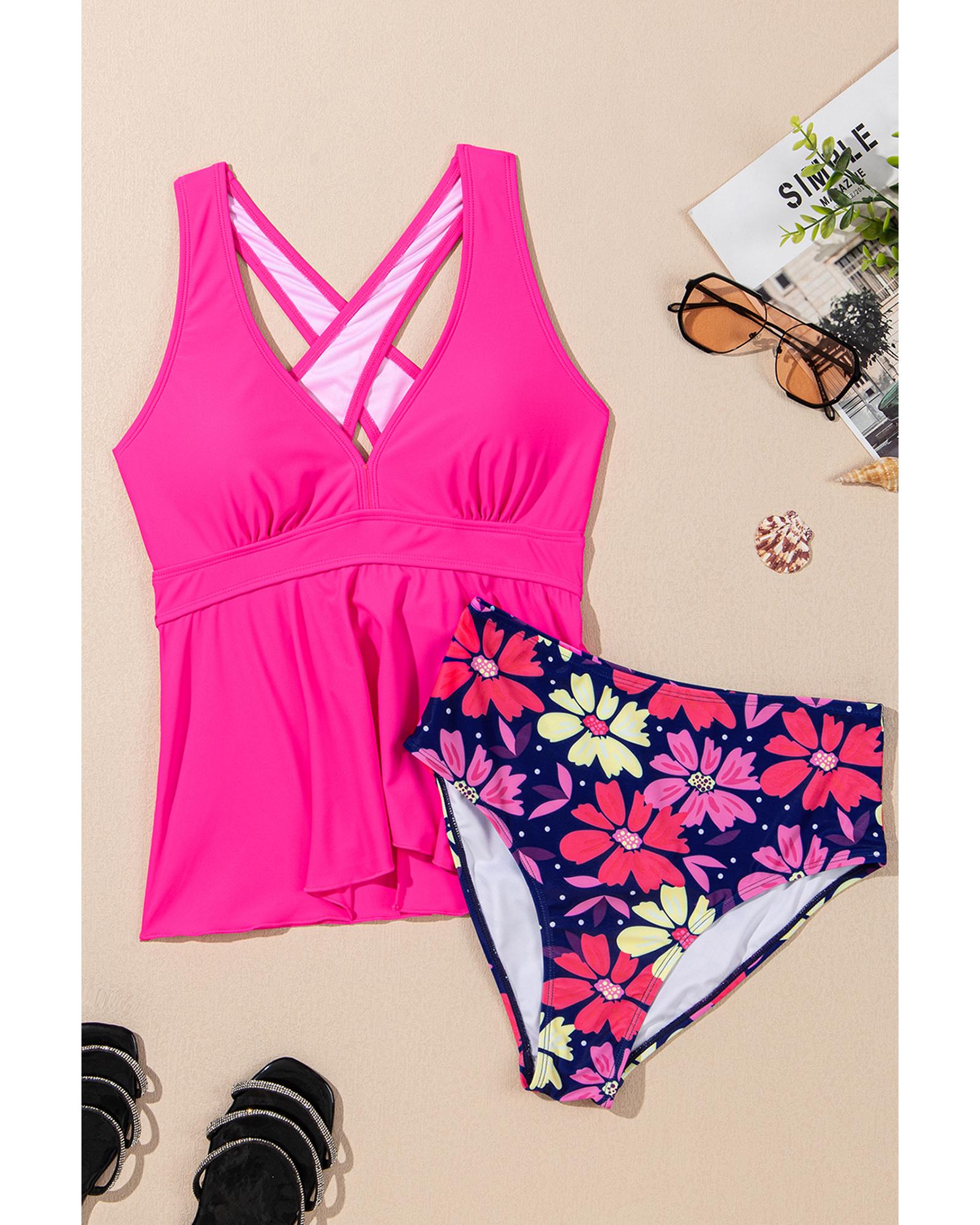 Rose V Neck Ruffled Hem Floral Bottom Tankini Set - M