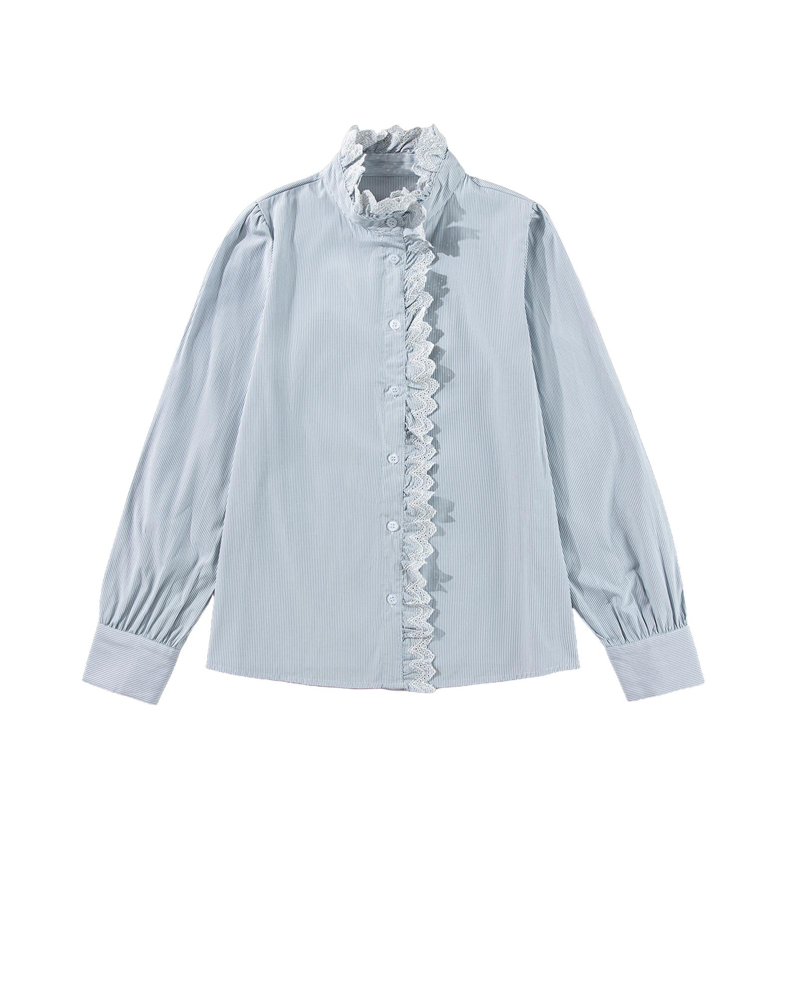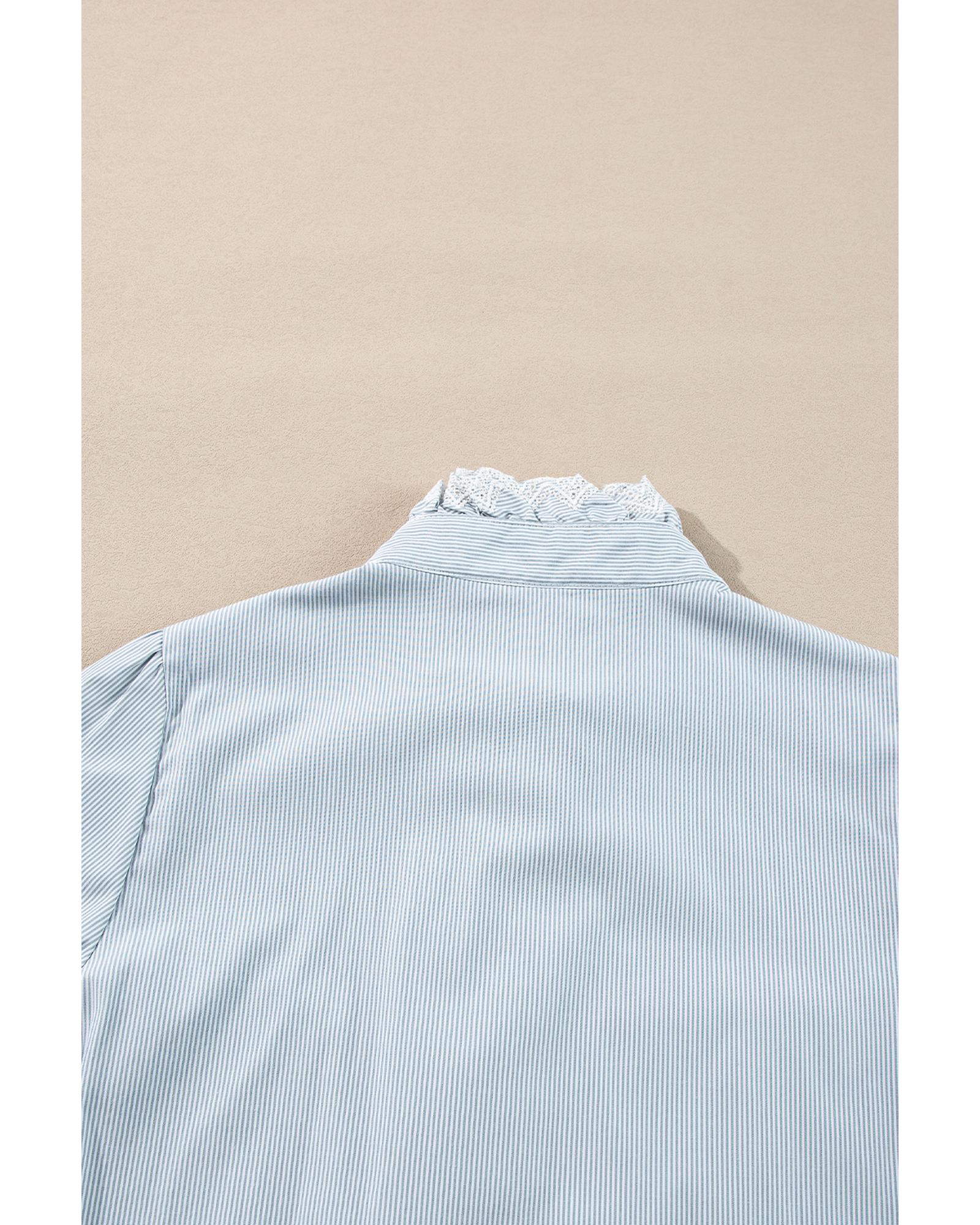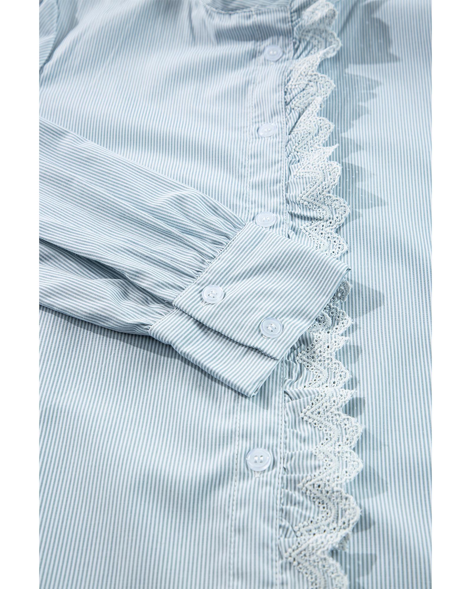 Sky Blue Stripe Frilled Trim Button Up Long Sleeve Shirt - M