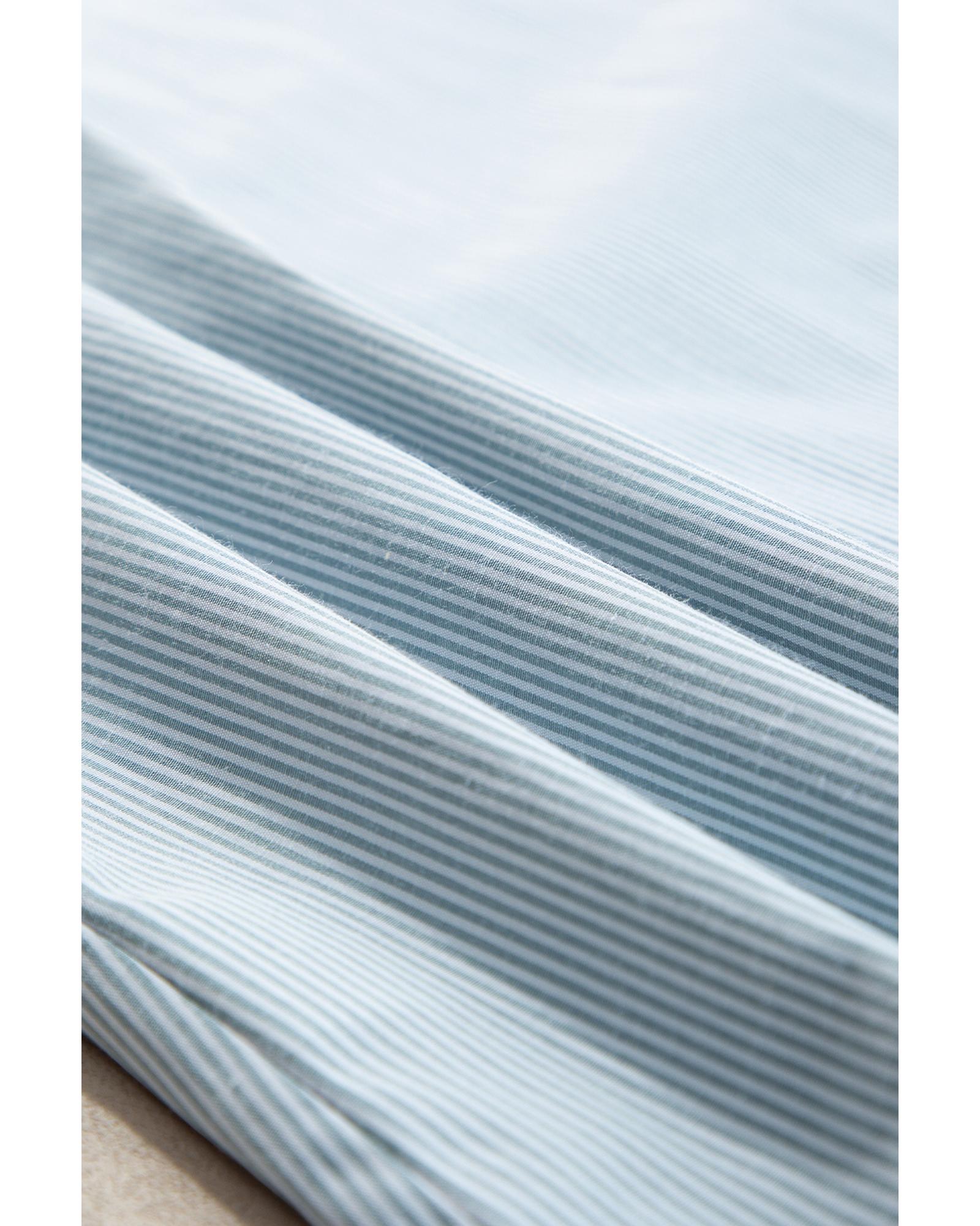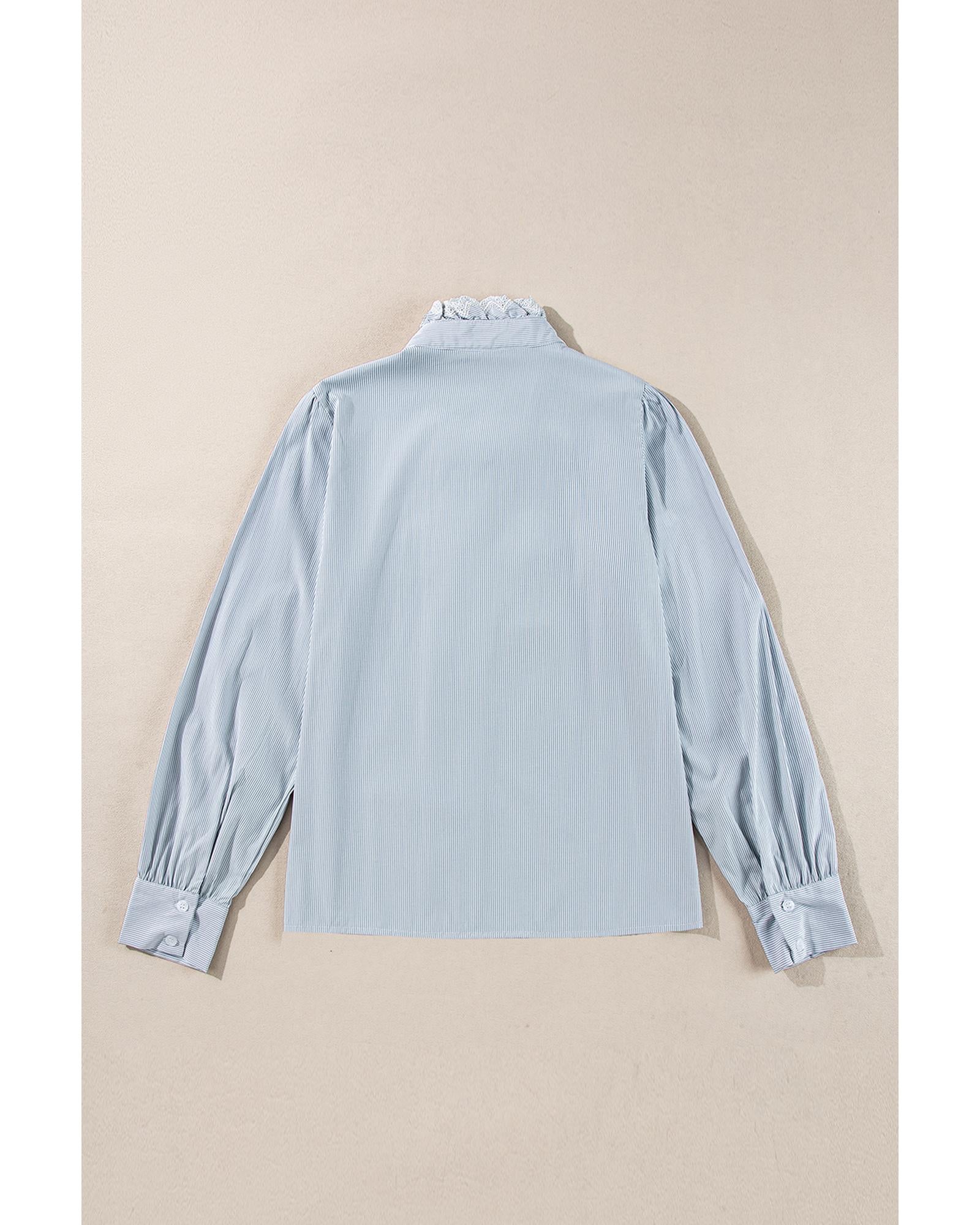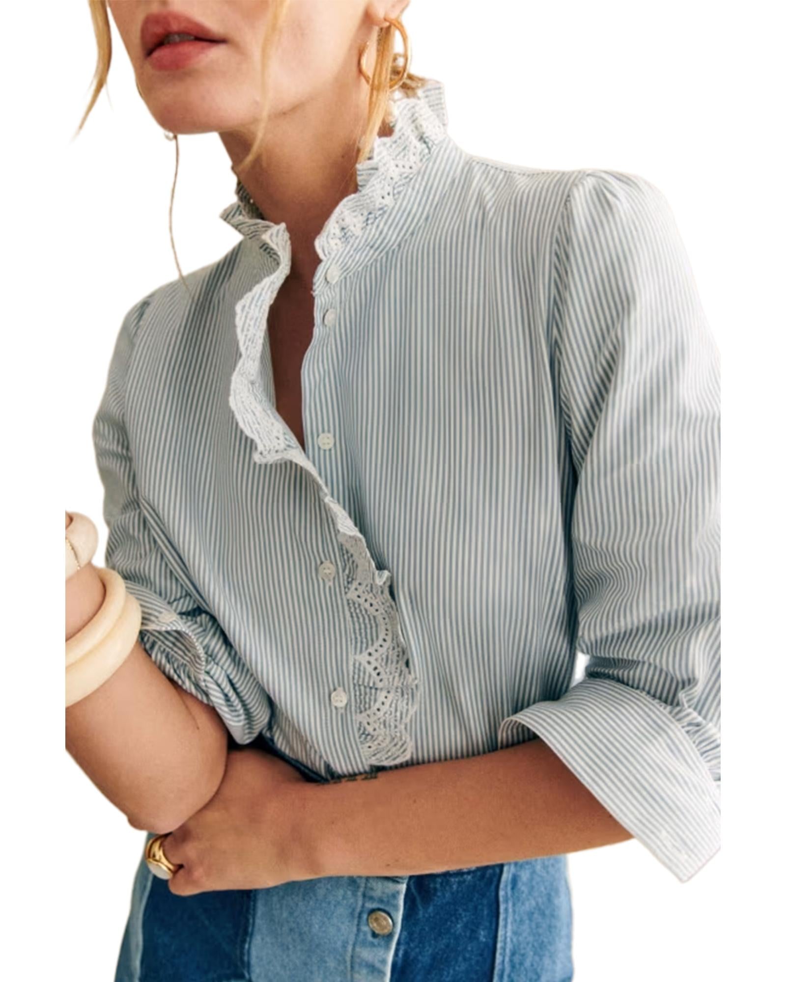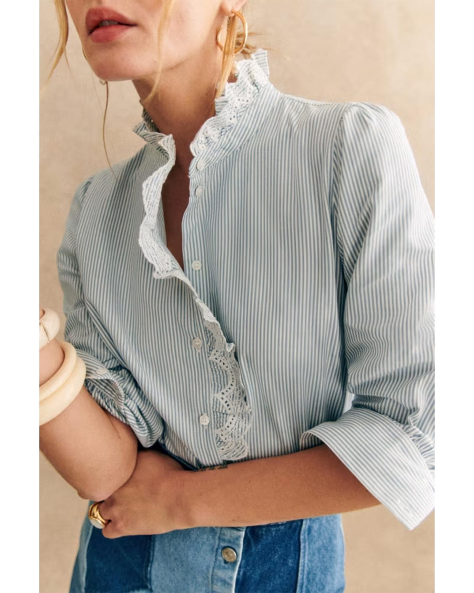 Sky Blue Stripe Frilled Trim Button Up Long Sleeve Shirt - M