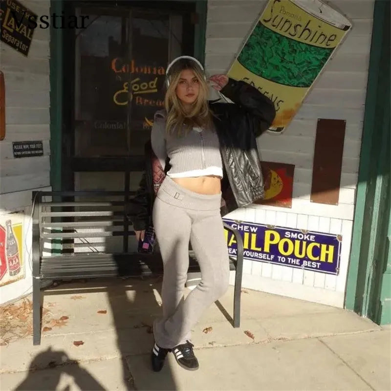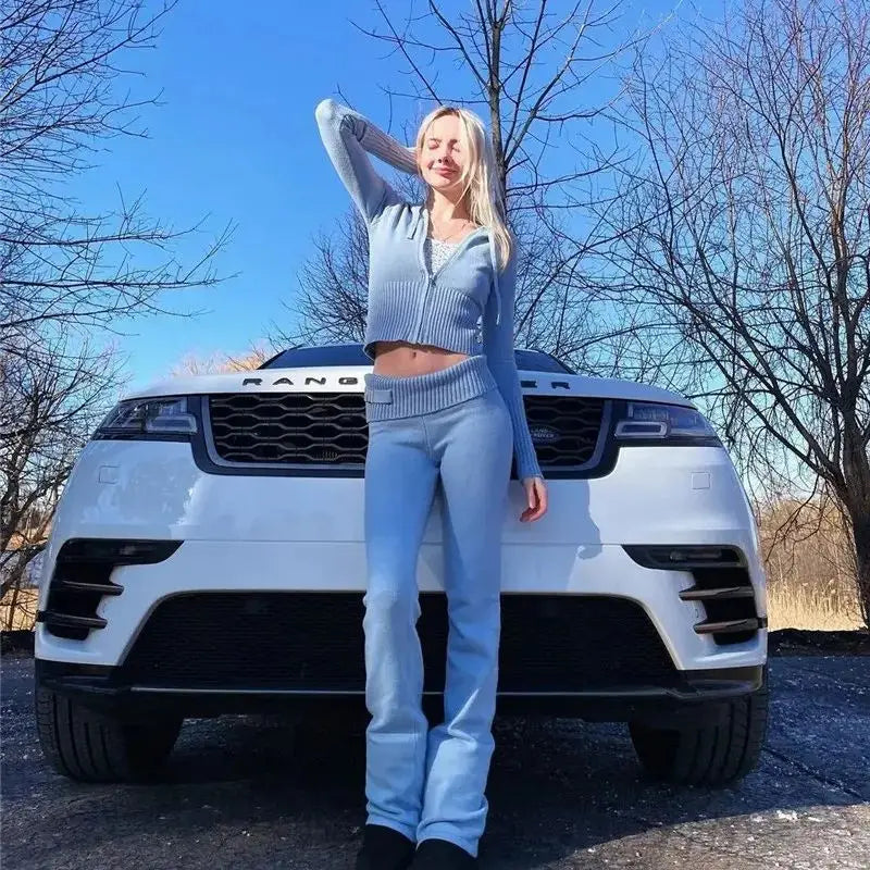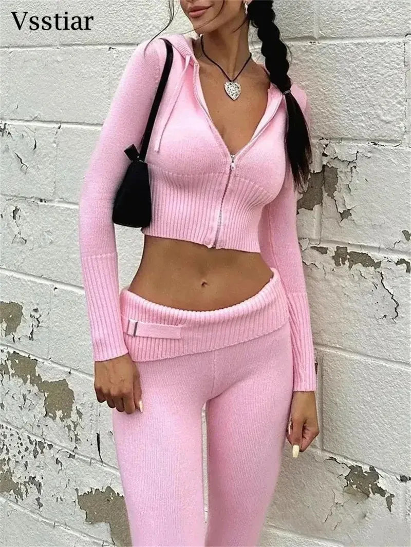 Vsstiar Women Casual Two Piece Set Long Sleeve Zip Up Hooded Crop Top High Waist Knitted Pants Fashion Solid Slim Matching Suits