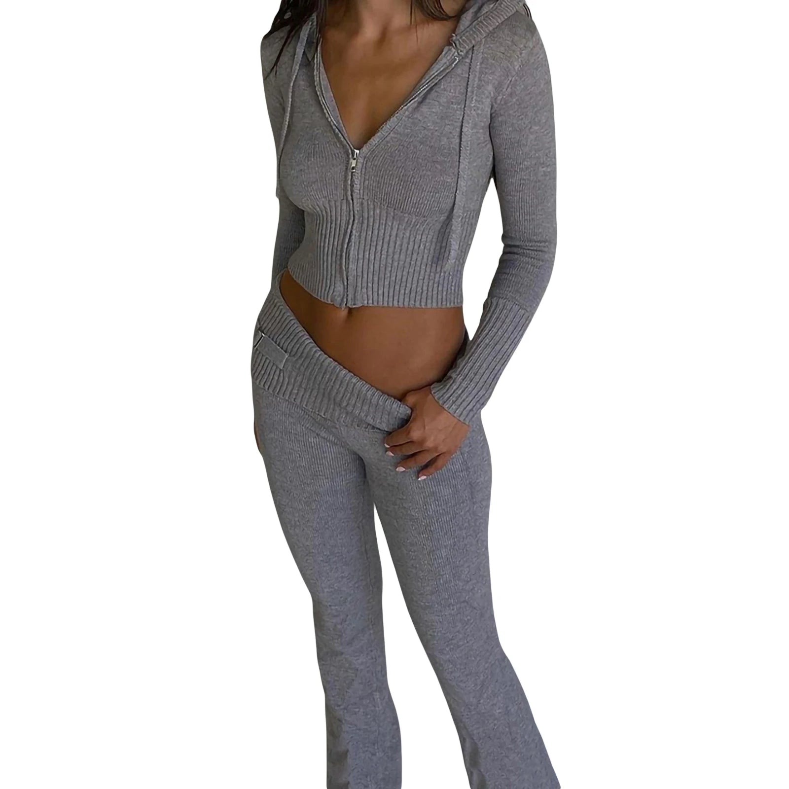 Women Fall 2 Piece Outfits Ribbed Knit Slim Fit Long Sleeve Zip Up Crop Jacket Skinny Flare Pants Loungewear Sets