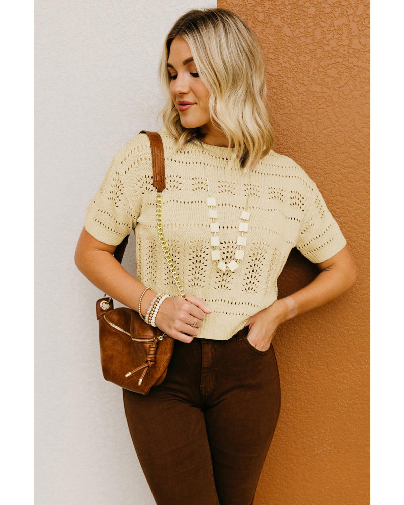 Beige Knitted Hollow out Short Sleeve Crop Sweater - L