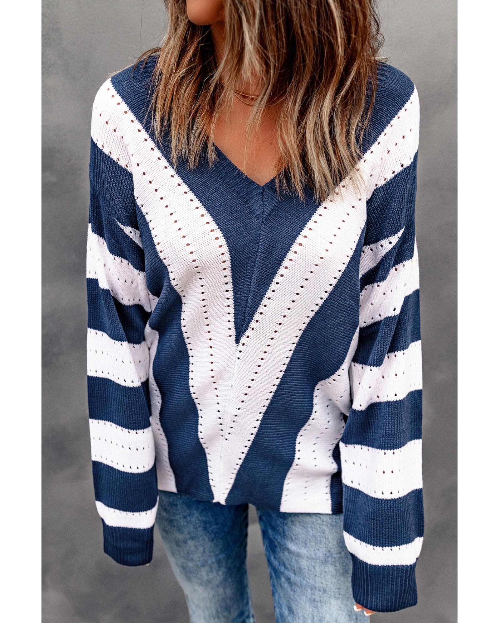 Blue Striped Colorblock V Neck Knitted Sweater - L