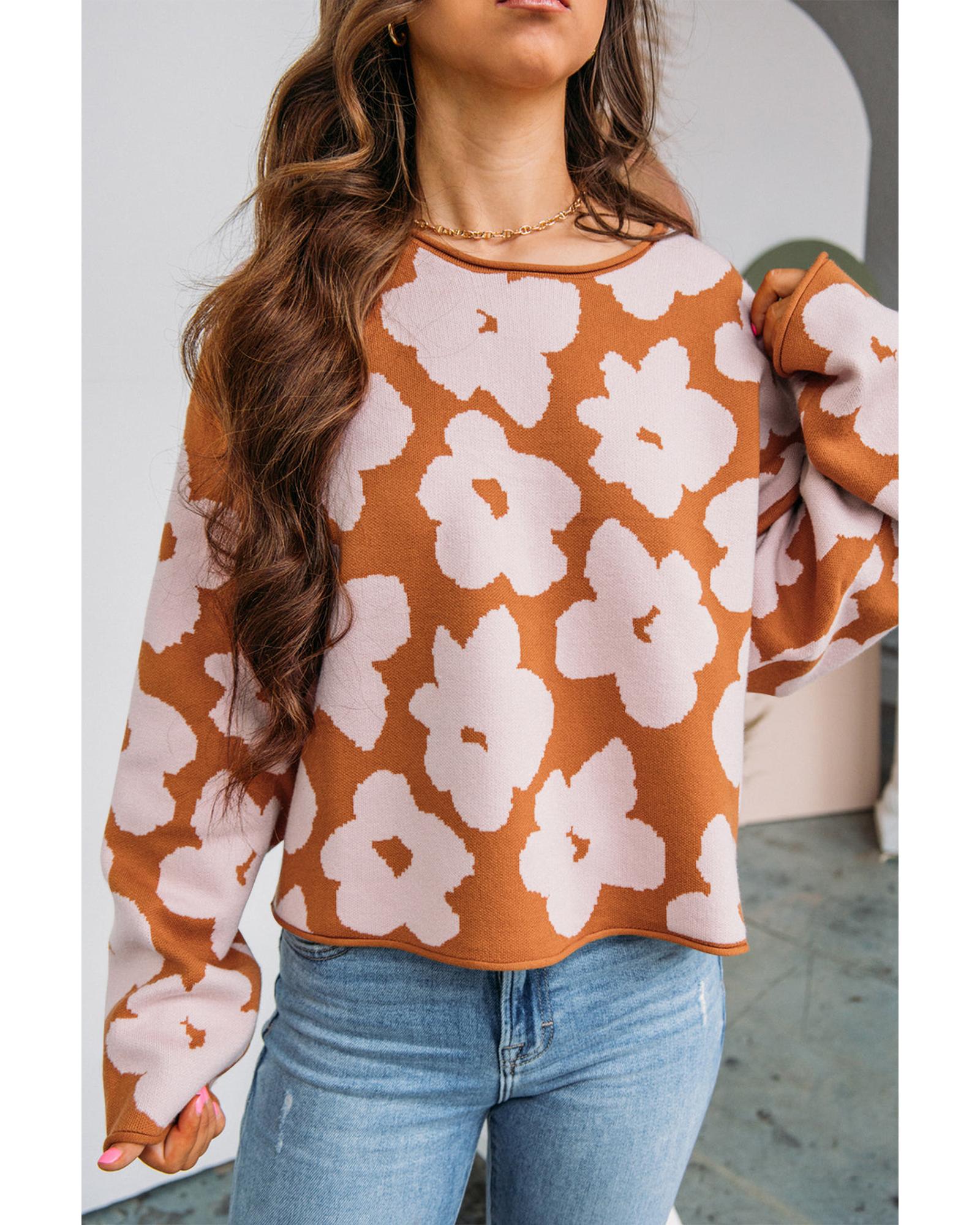 Brown Floral Pattern Crew Neck Long Sleeve Loose Sweater - XL