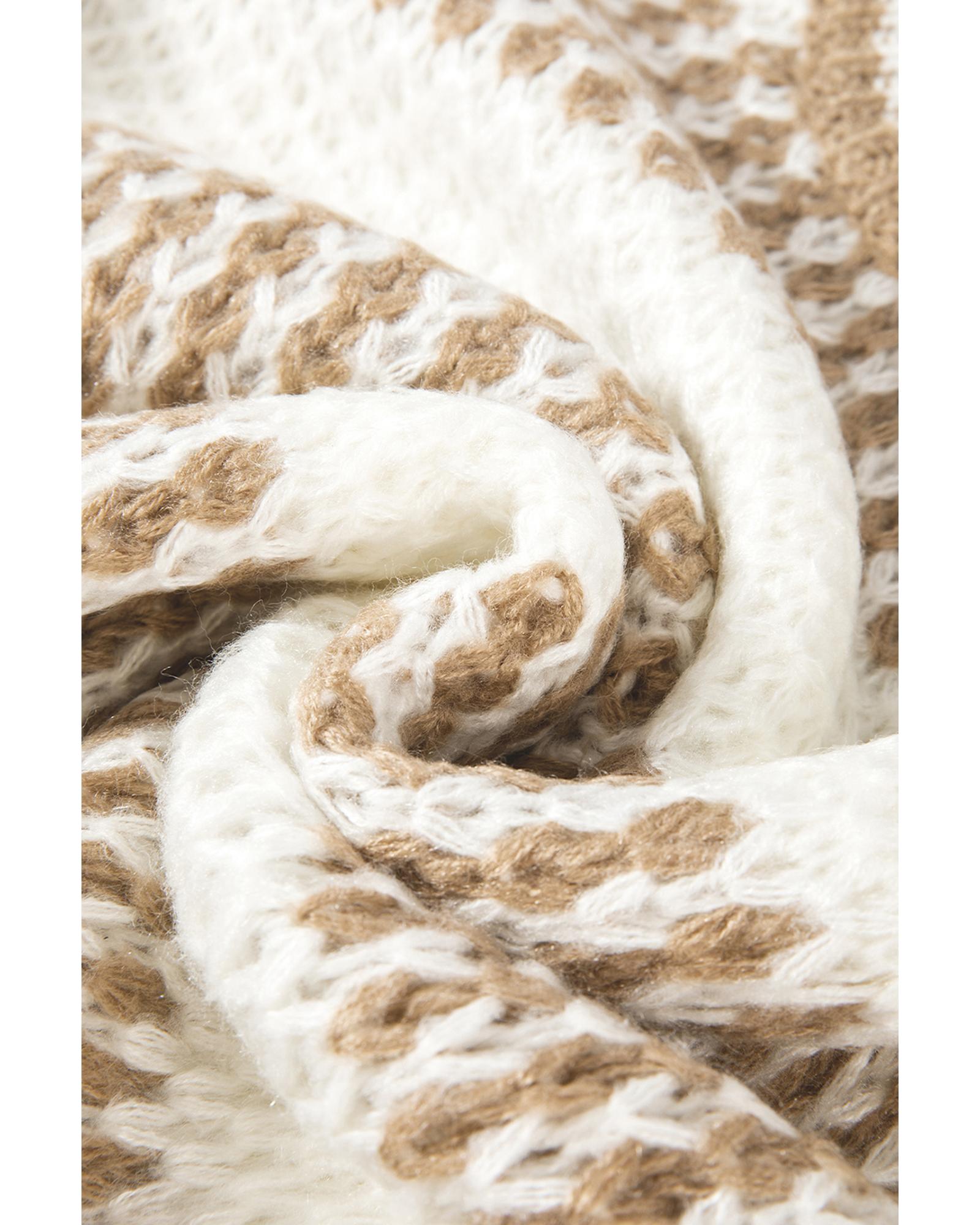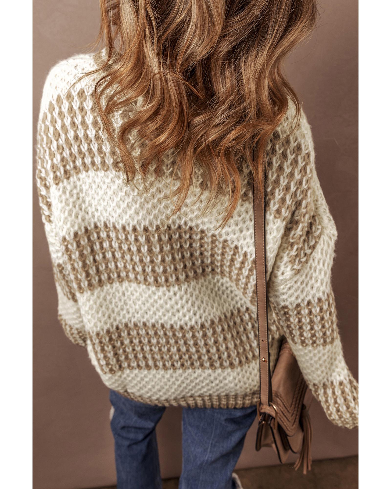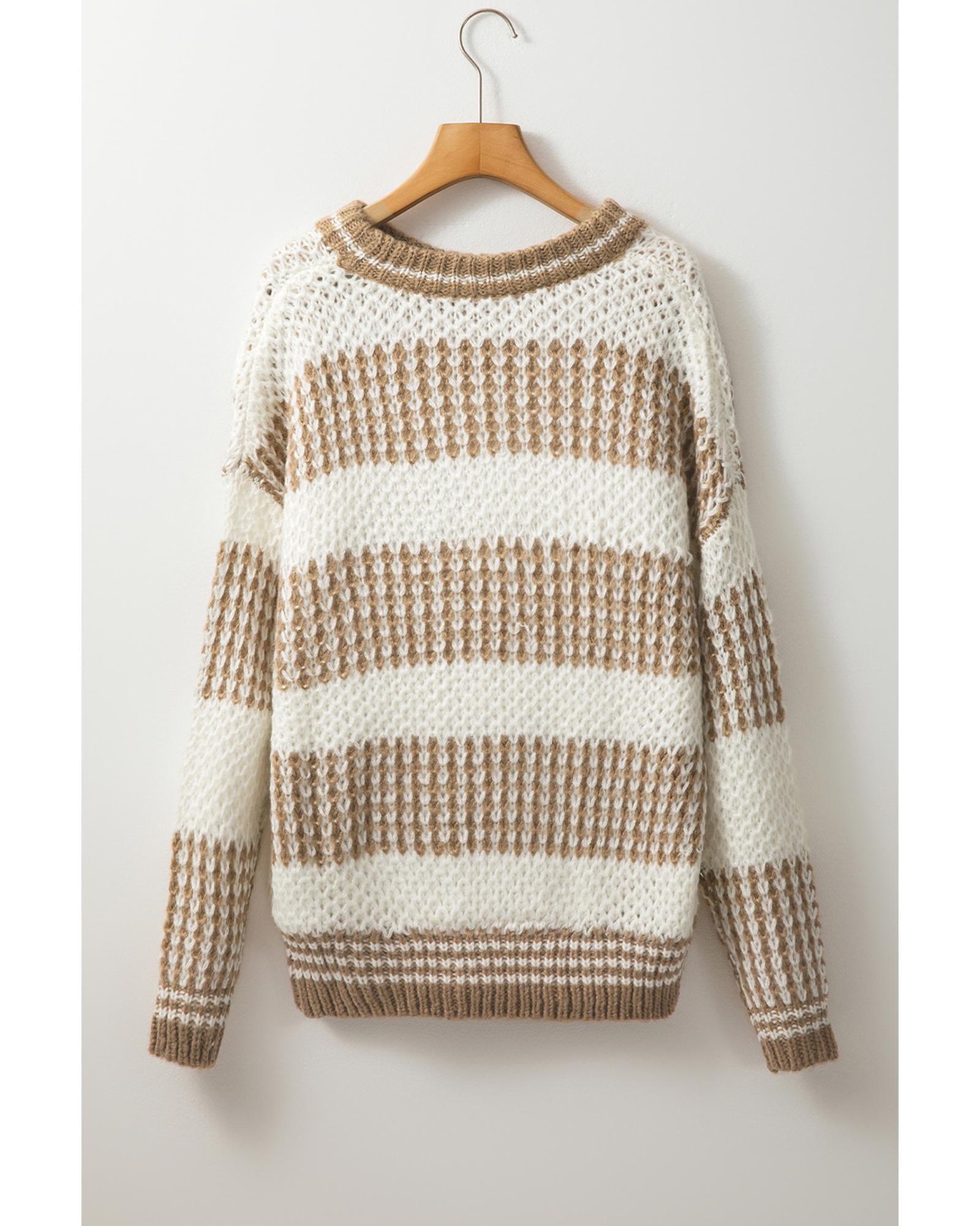 Brown Stripe Drop Shoulder Round Neck Loose Sweater - M