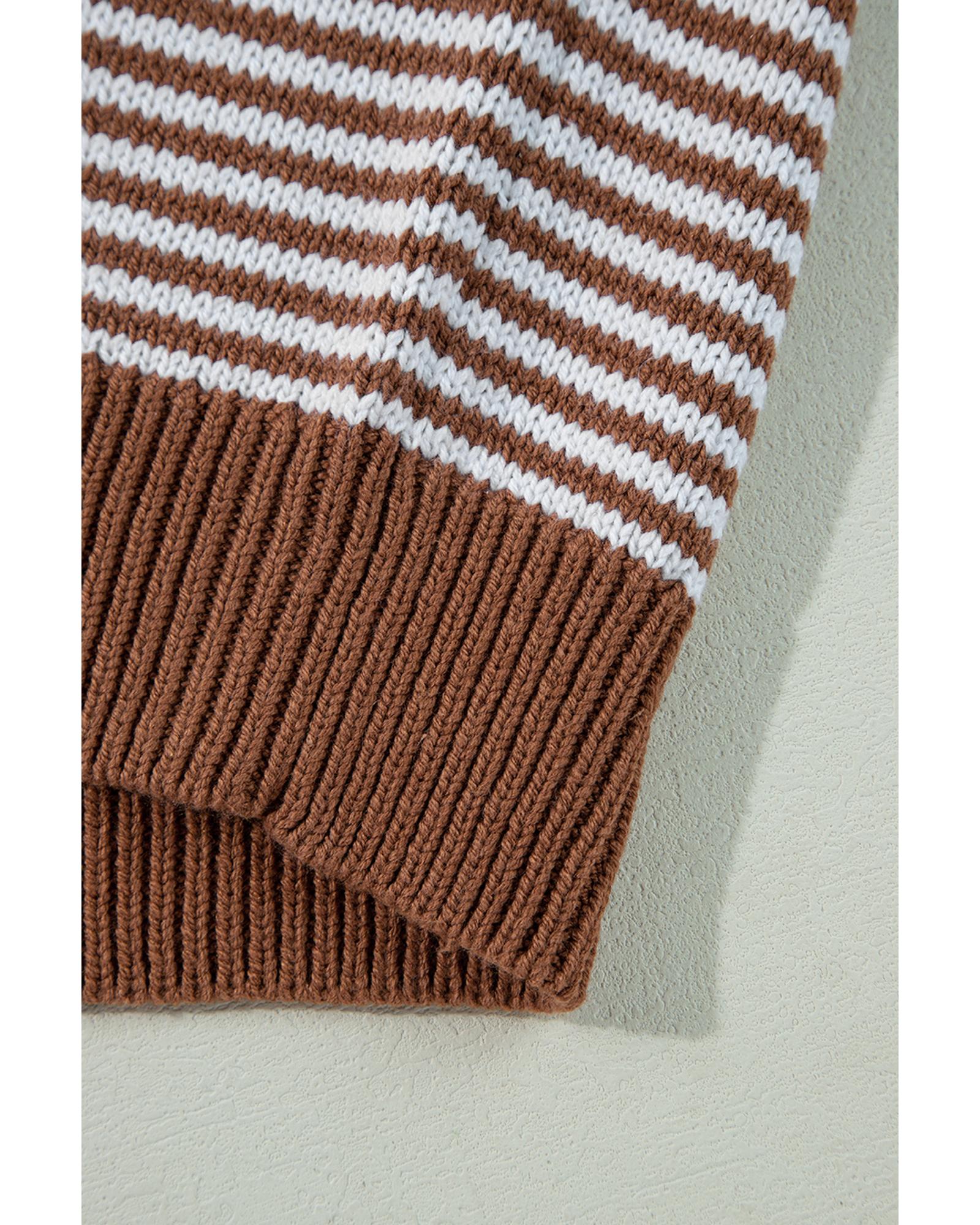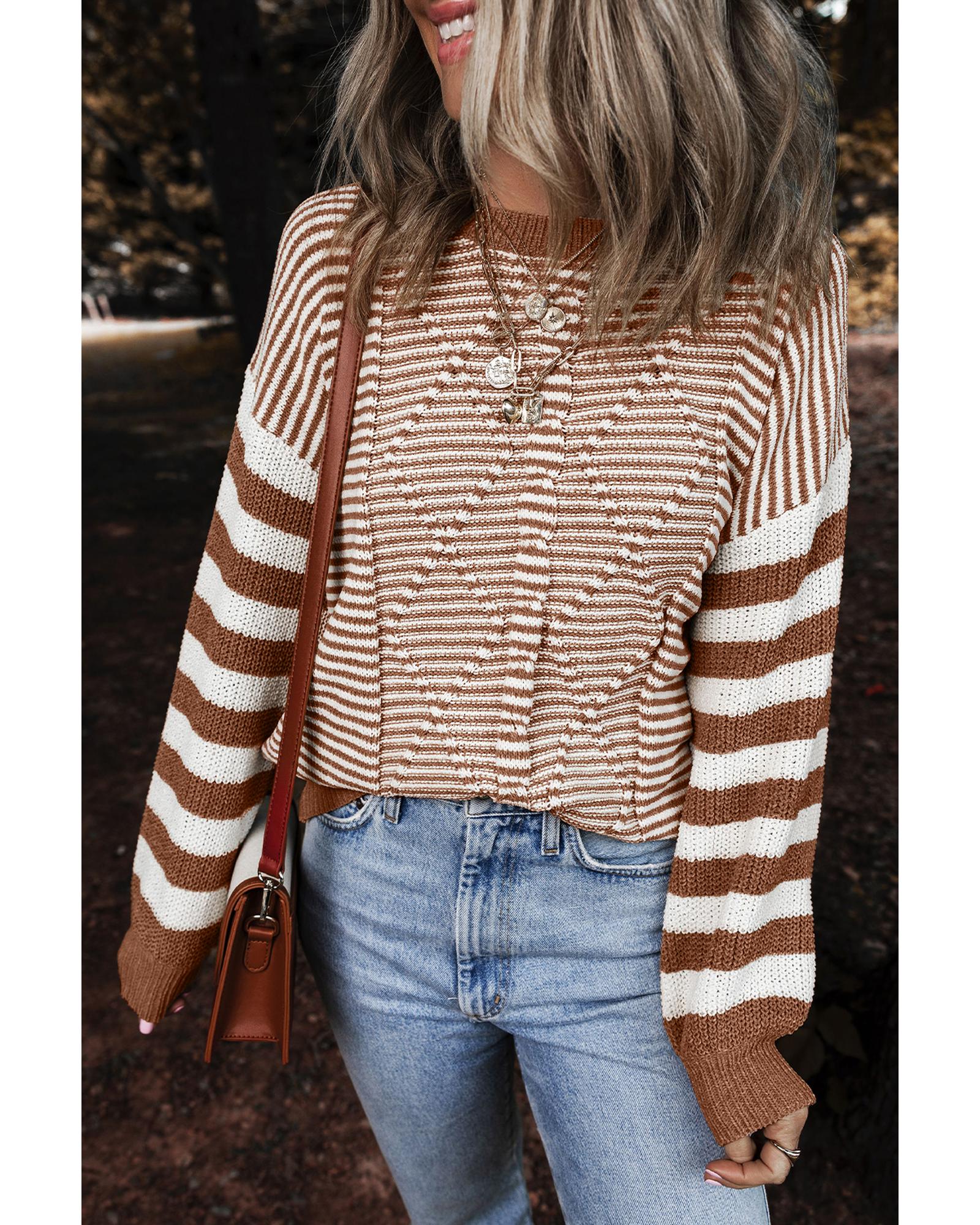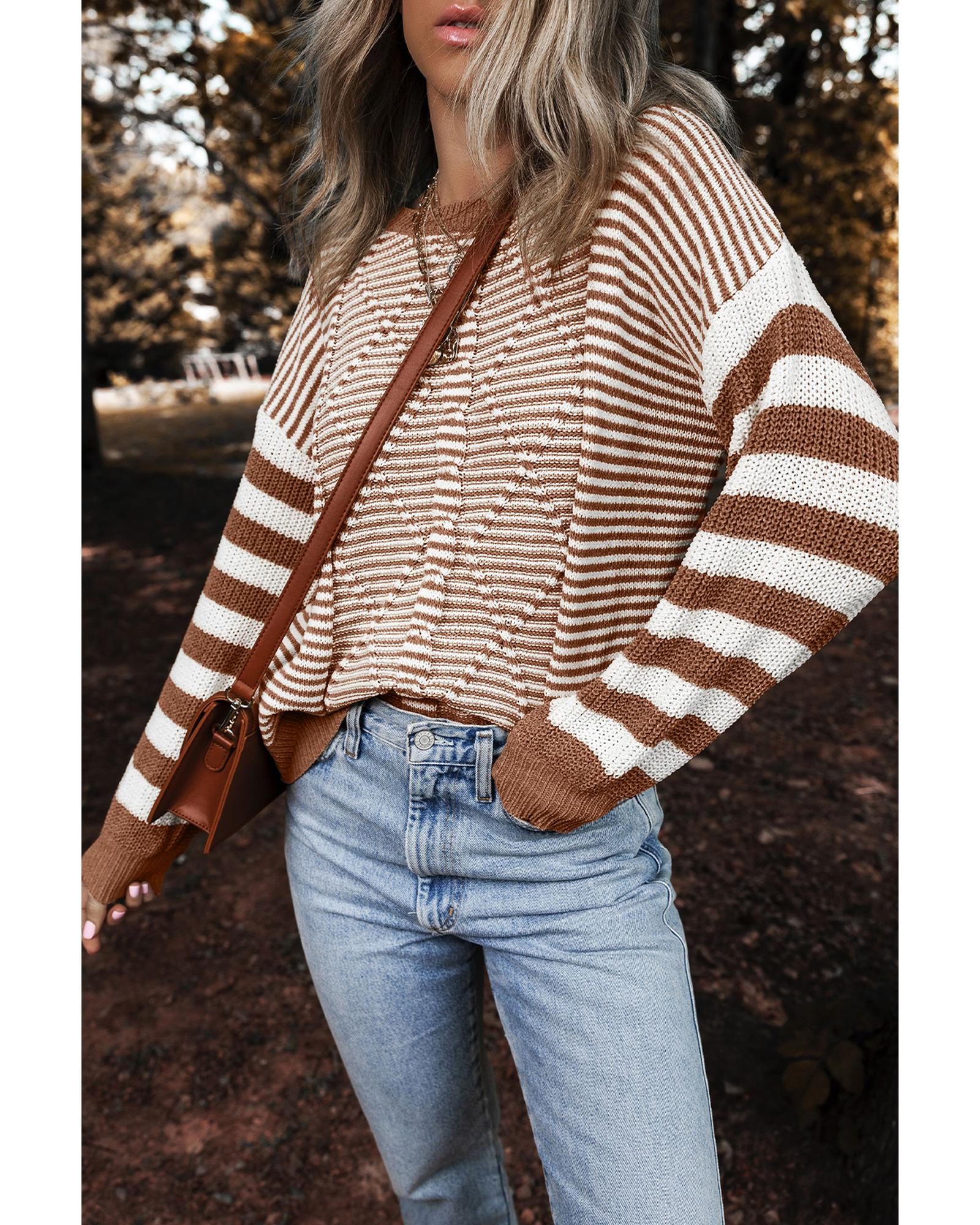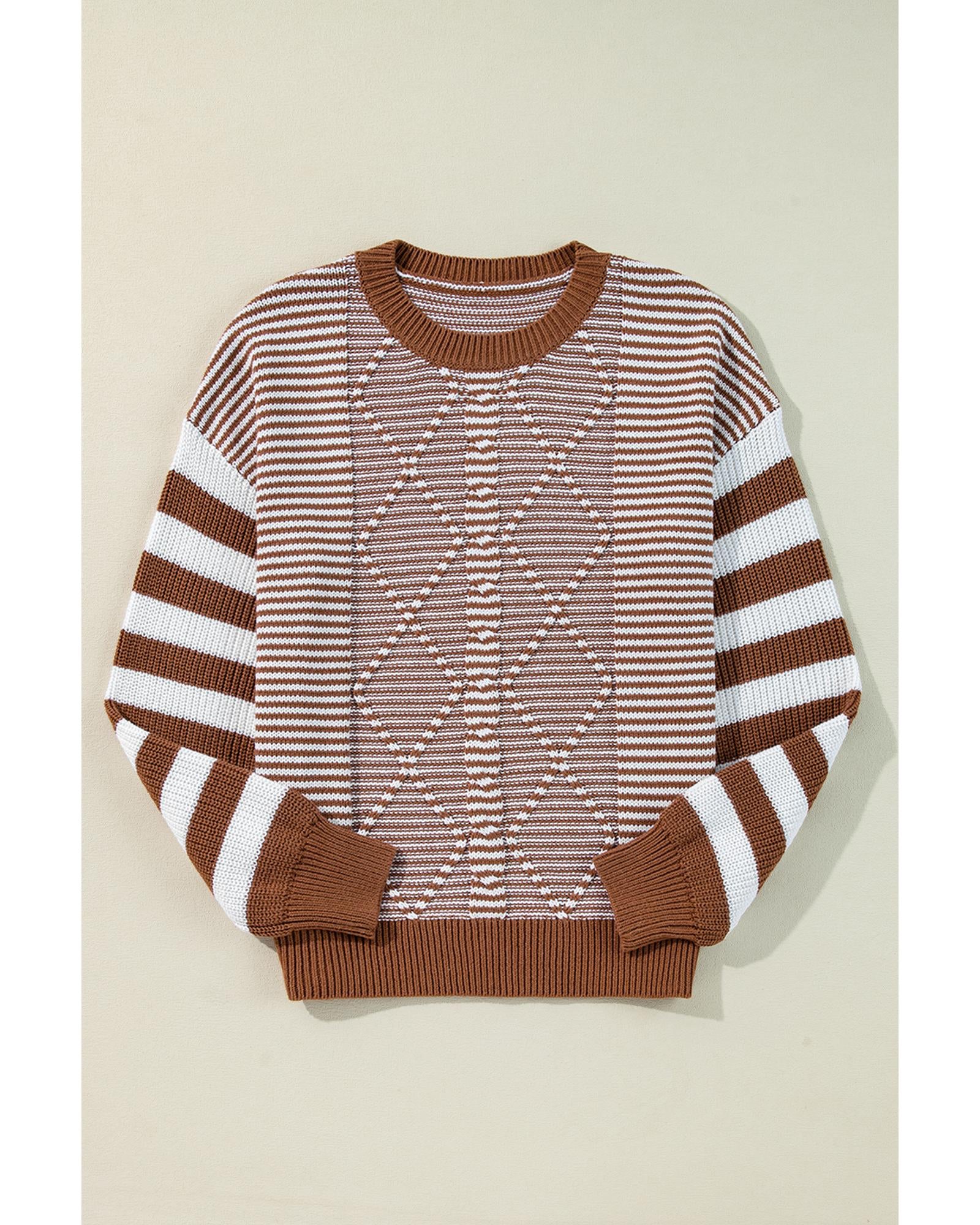 Brown Stripe Geometric Textured Drop Shoulder Sweater - S
