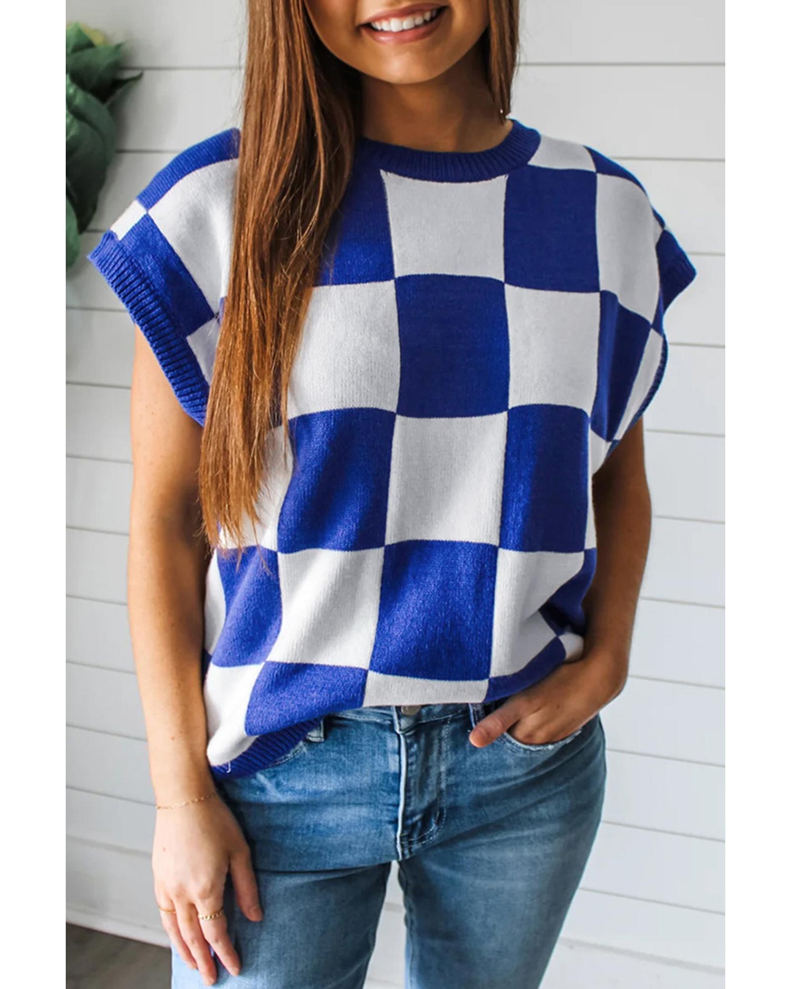 Dark Blue Cherckerboard Round Neck Sweater Vest - S
