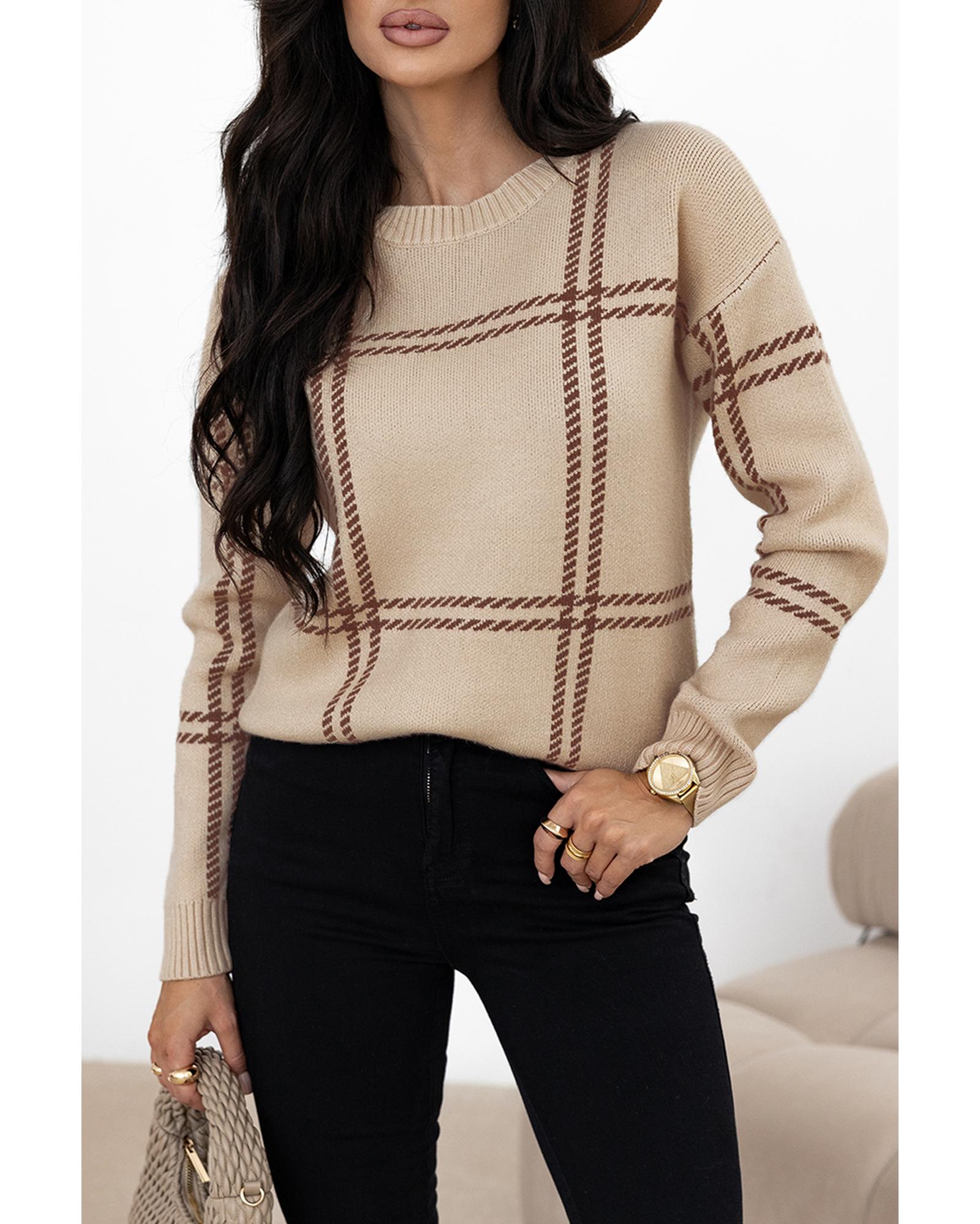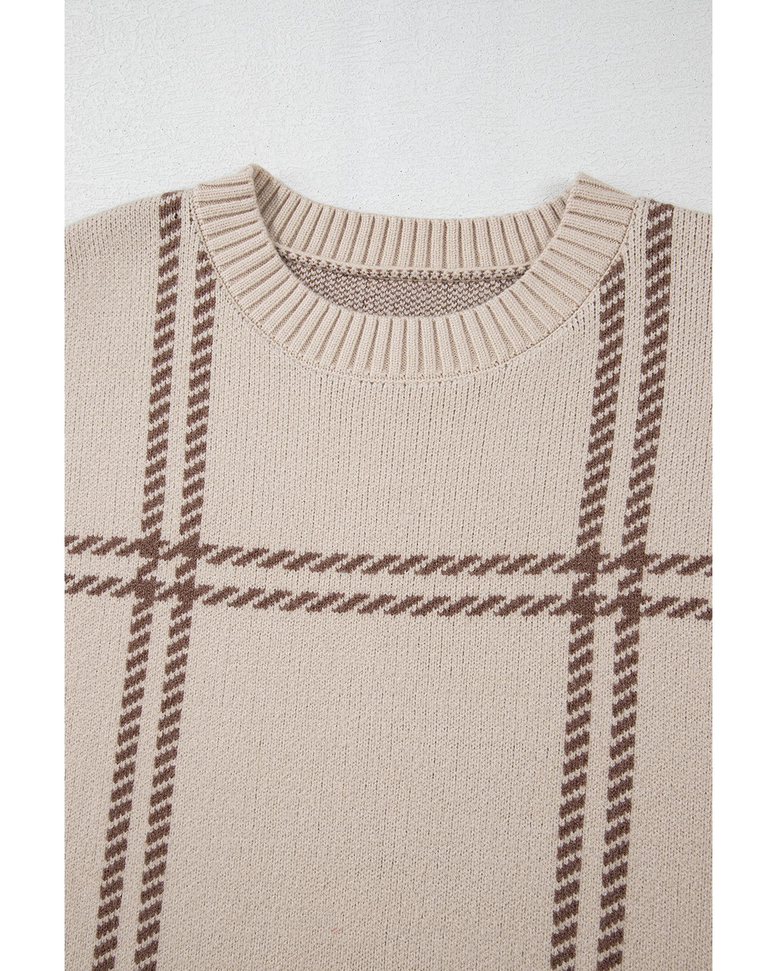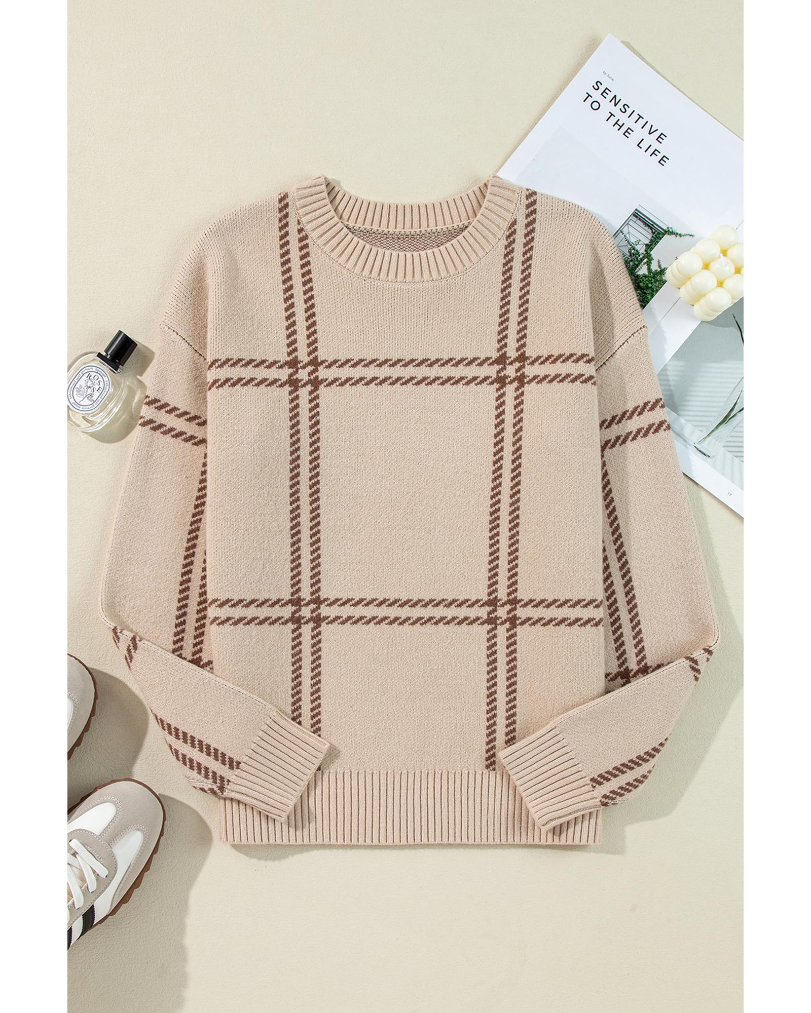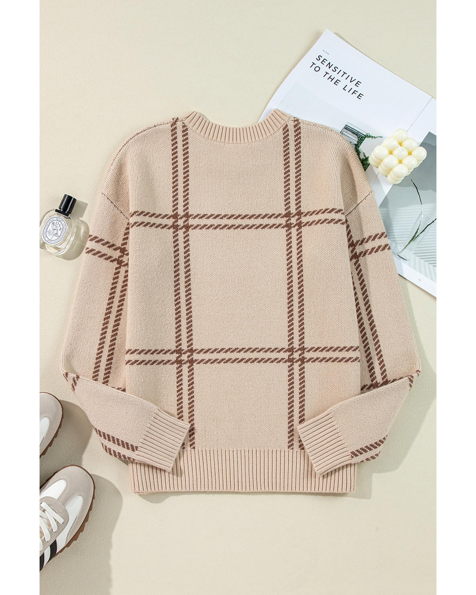 Khaki Plaid Pattern Knitted Drop Shoulder Sweater - S