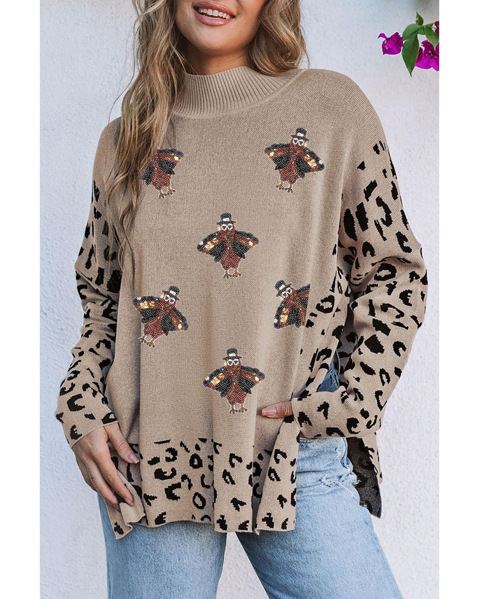 Khaki Sequin Turkey Leopard Mixed Pattern High Neck Sweater with Slits - L