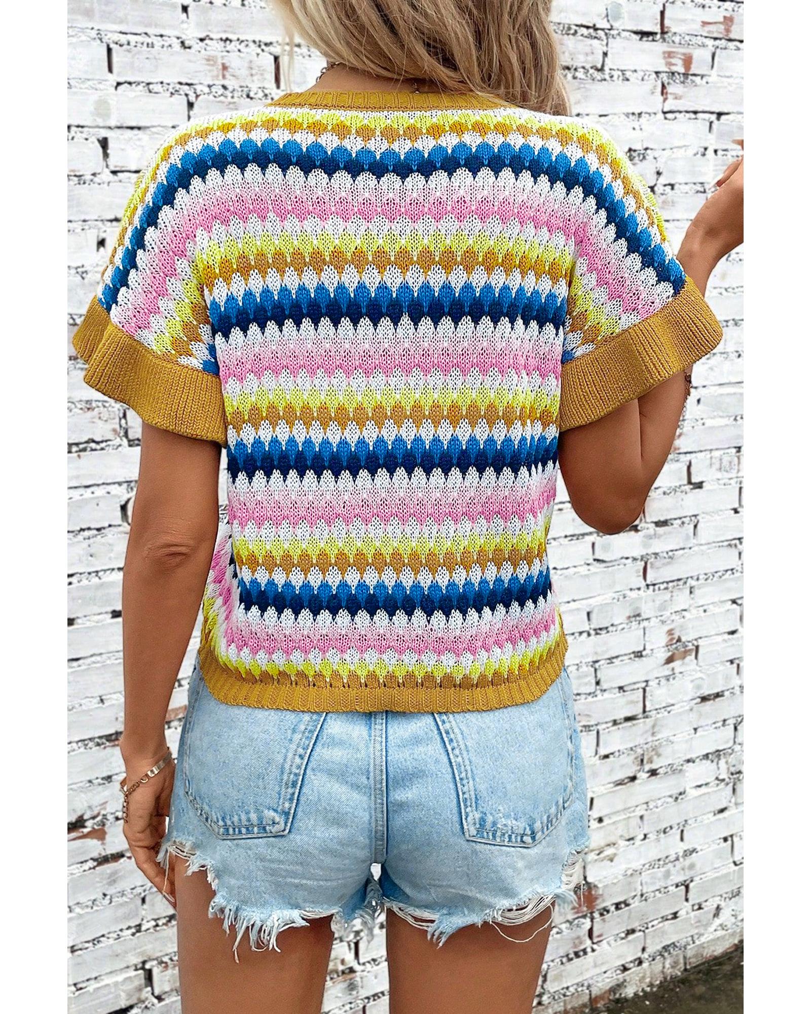 Khaki Trimmed Ruffle Sleeve Colorful Textured Sweater - M