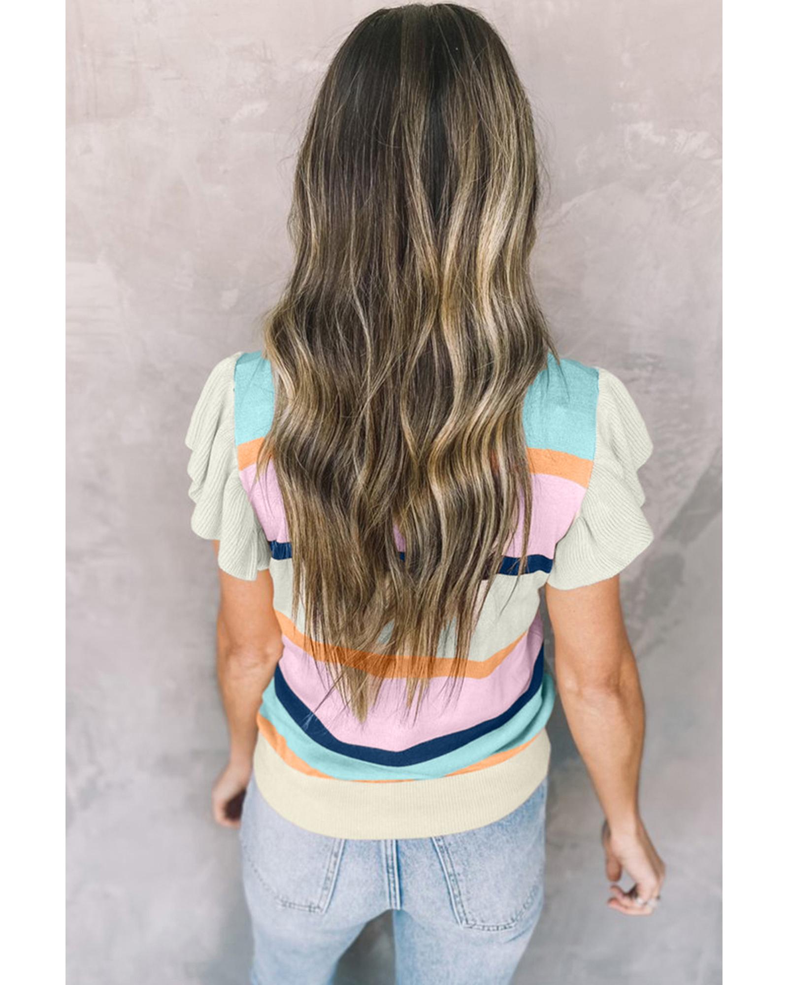 Multicolour Striped Color Block Flutter Sleeve Patchwork Sweater Top - L