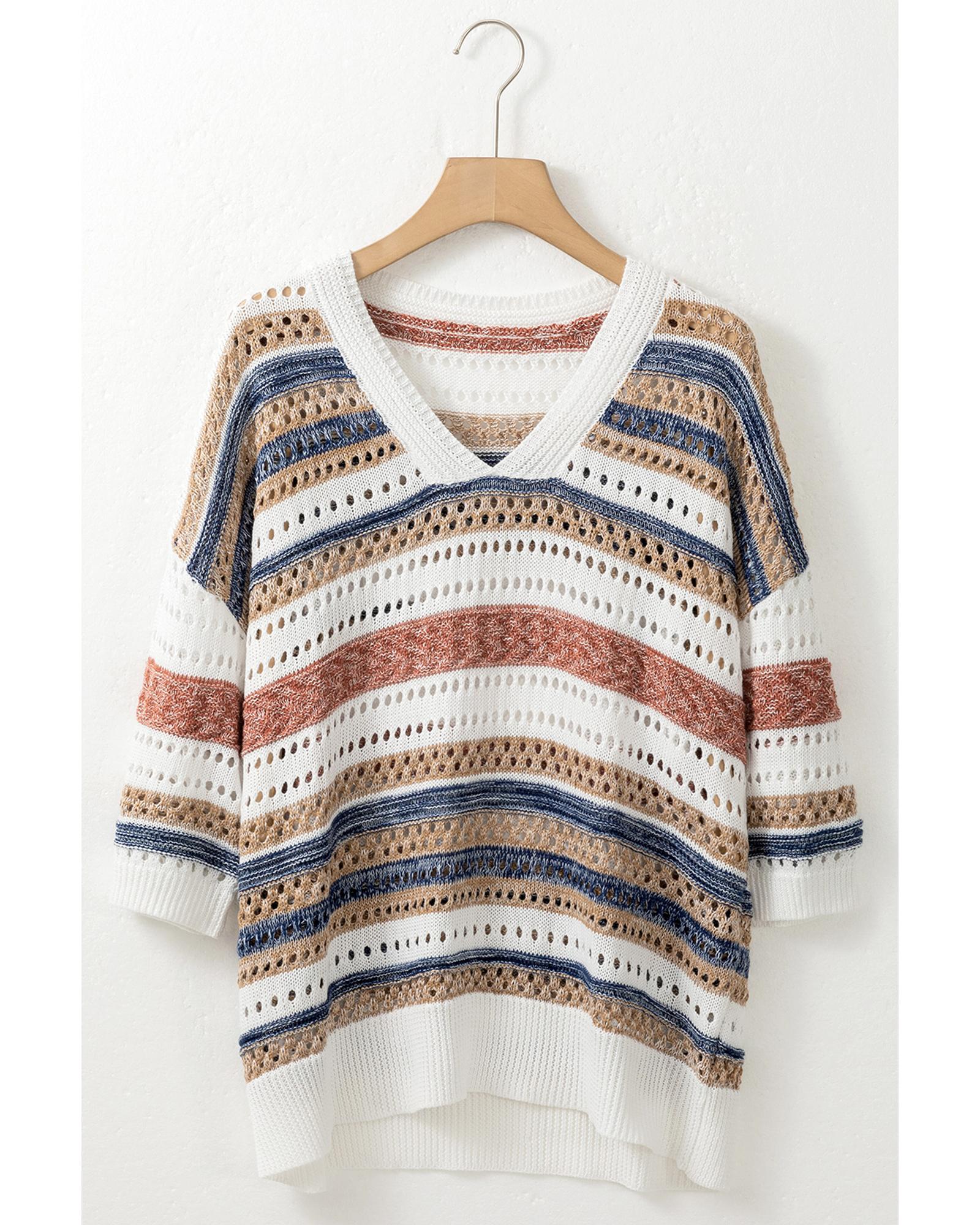 Multicolour Striped Hollow Out Half Sleeve Knitted Sweater - L