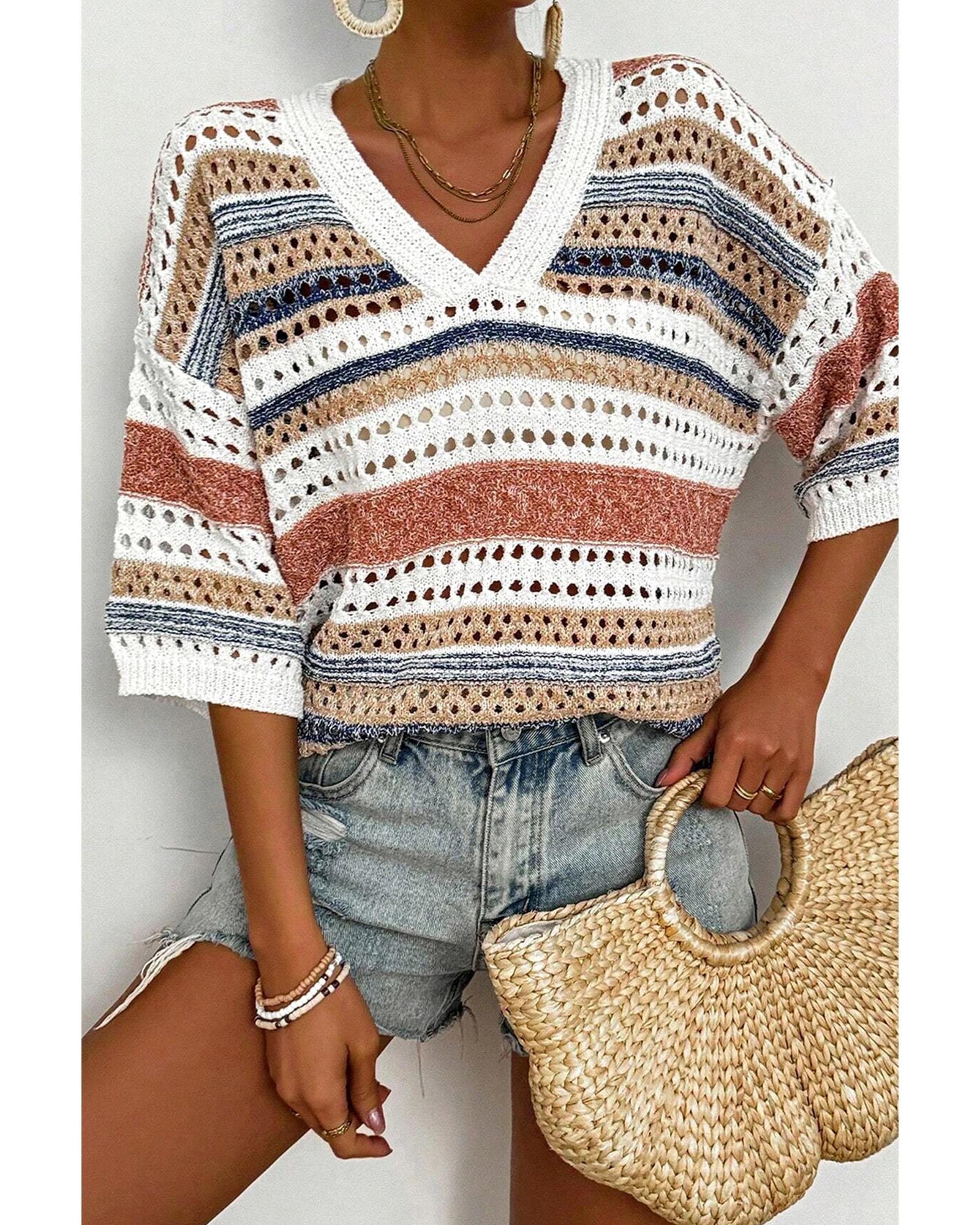 Multicolour Striped Hollow Out Half Sleeve Knitted Sweater - M