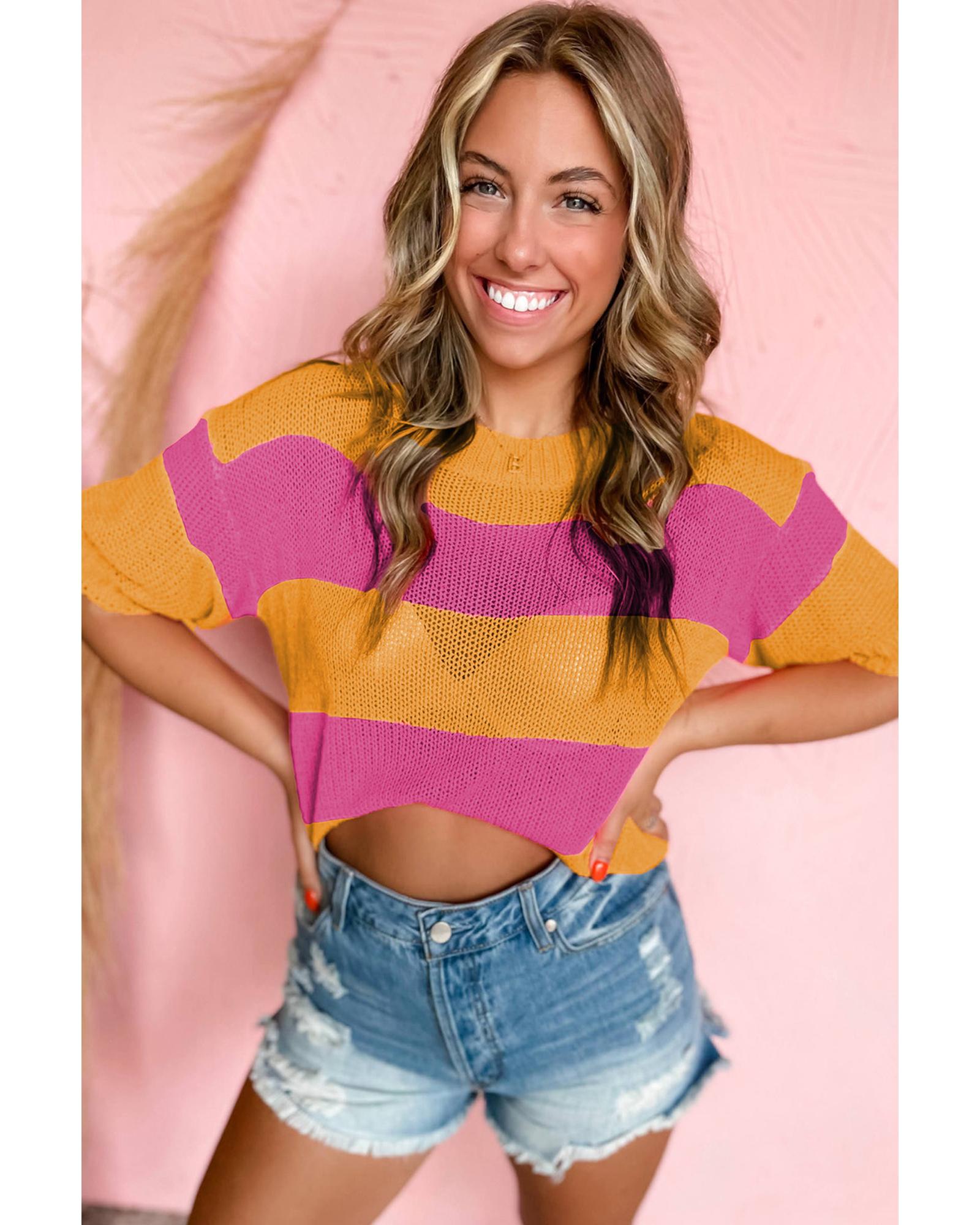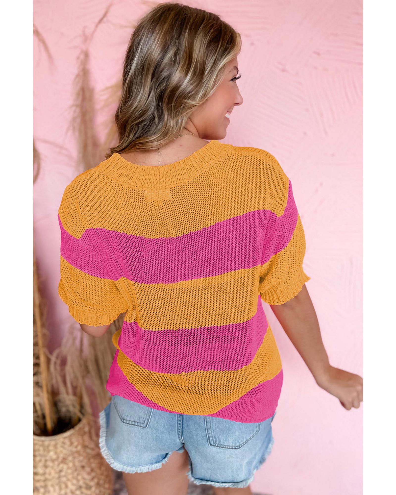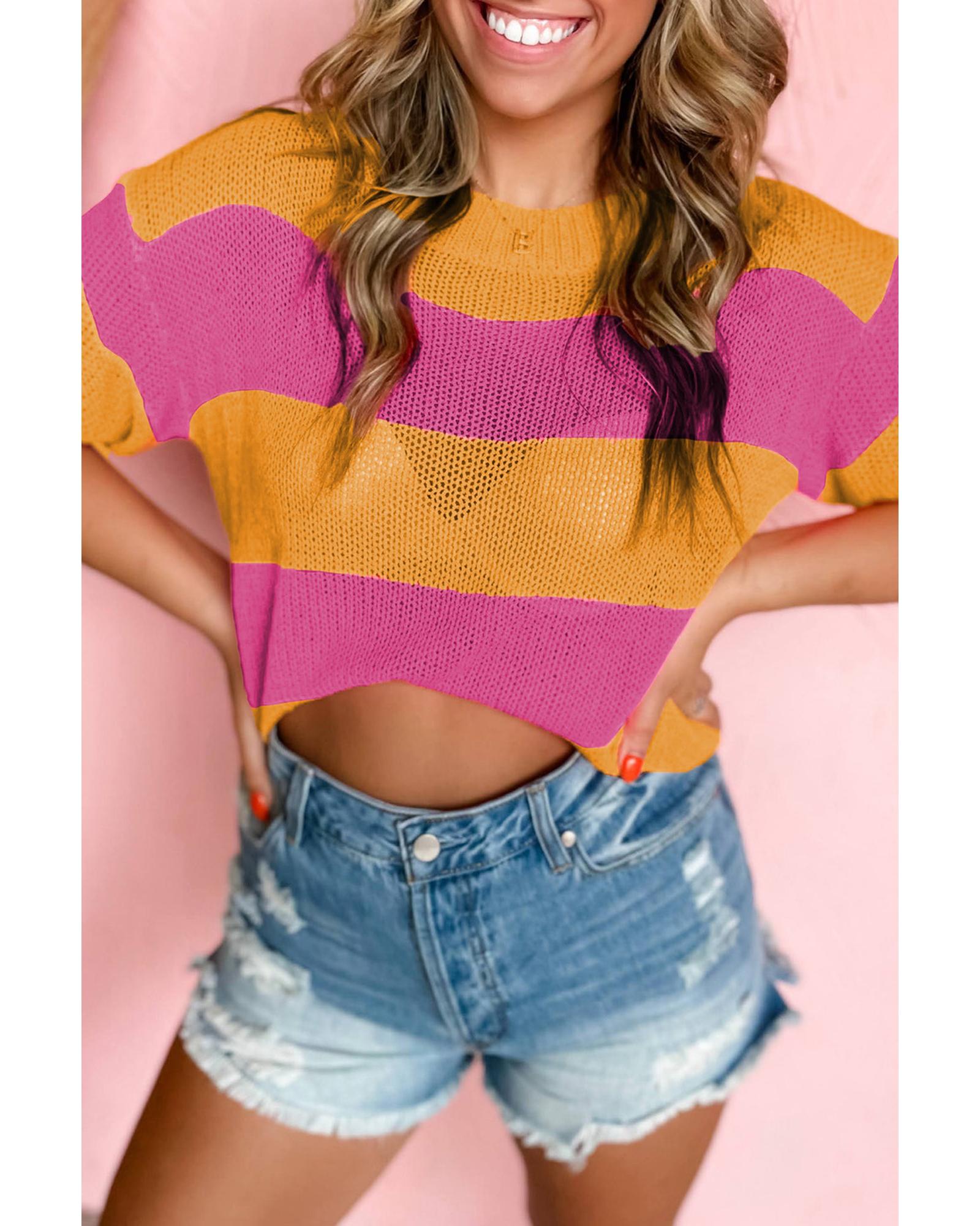 Orange Stripe Color Block Knitted T-shirt Sweater - M