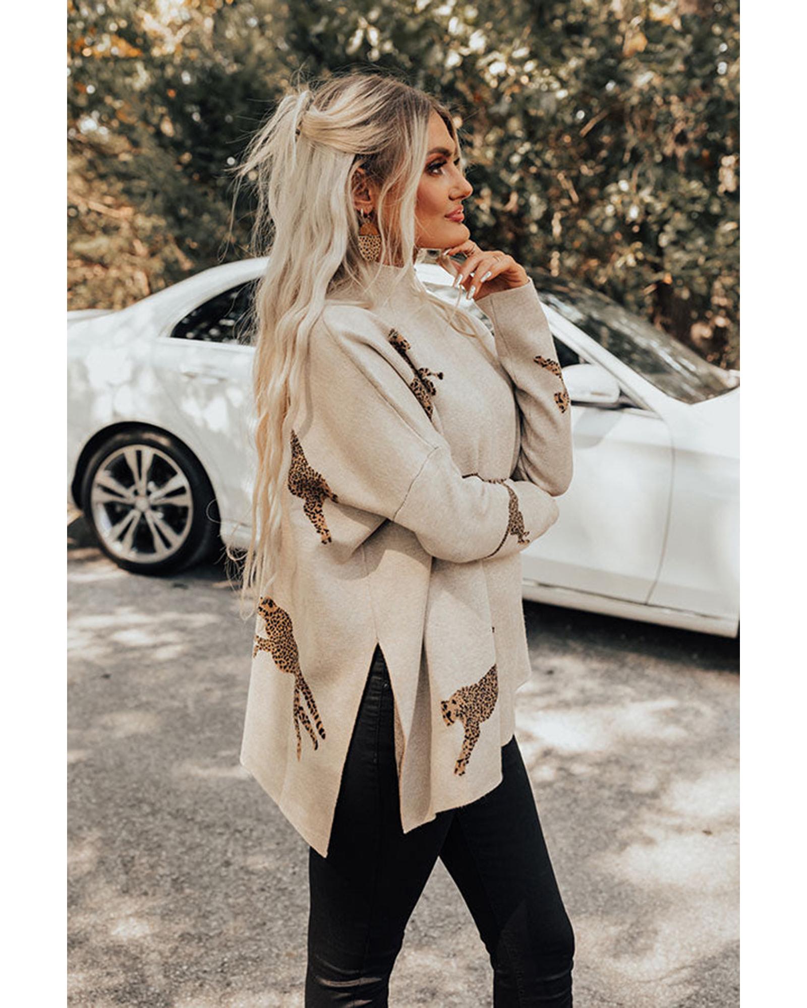 Gray Leopard High Neck Side Slit Oversized Sweater - L