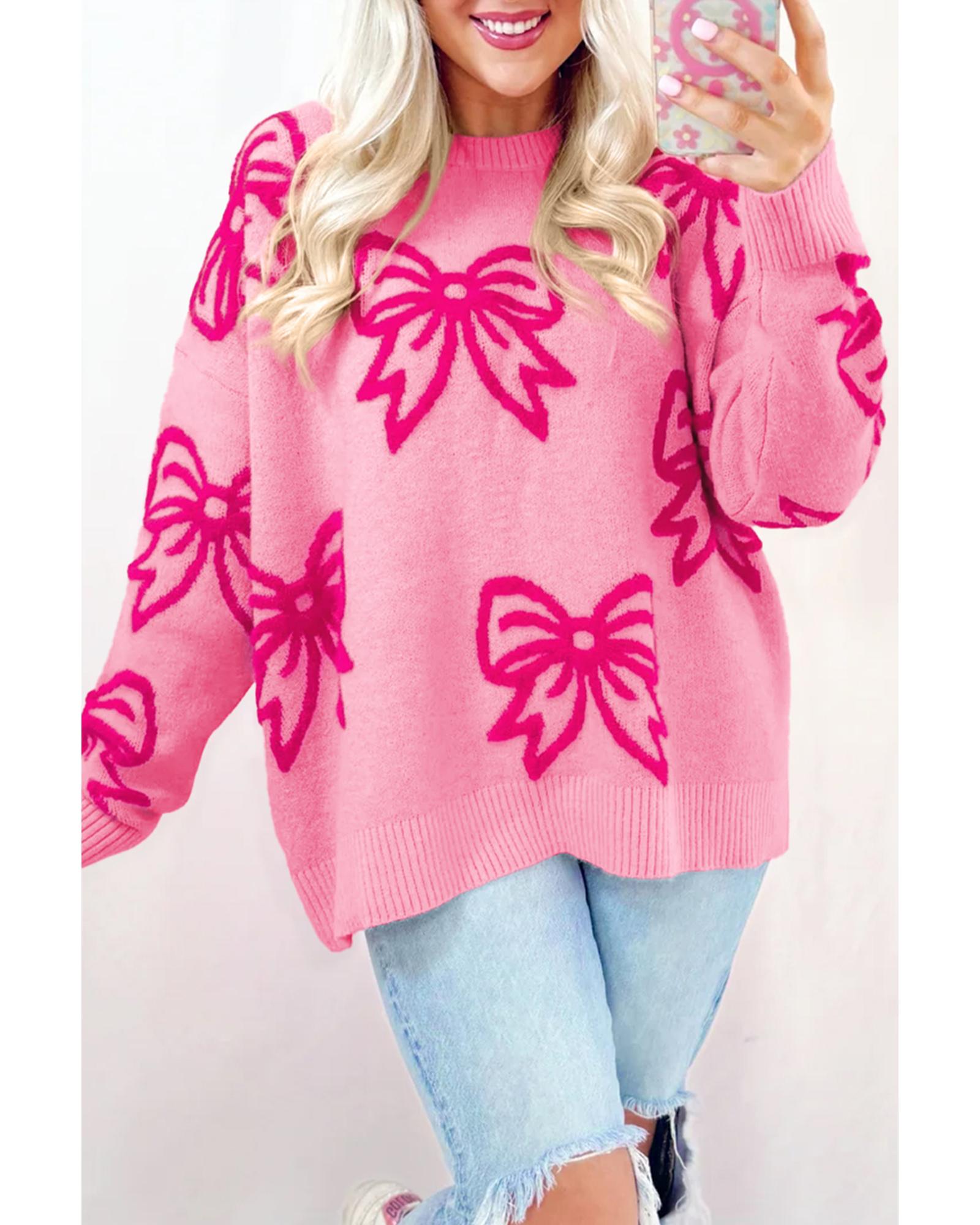 Pink Bow Pattern Drop Shoulder Loose Sweater - L