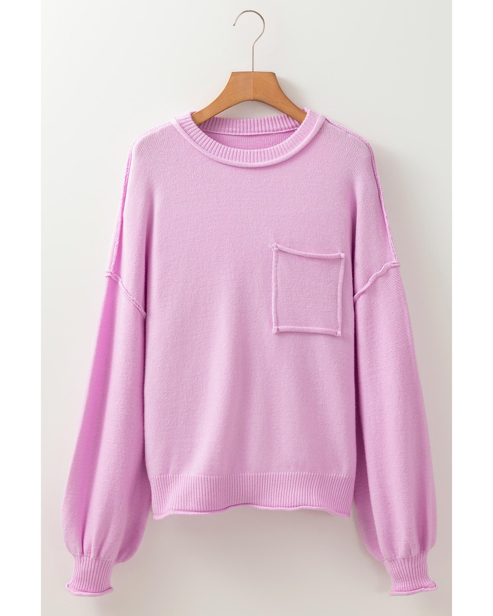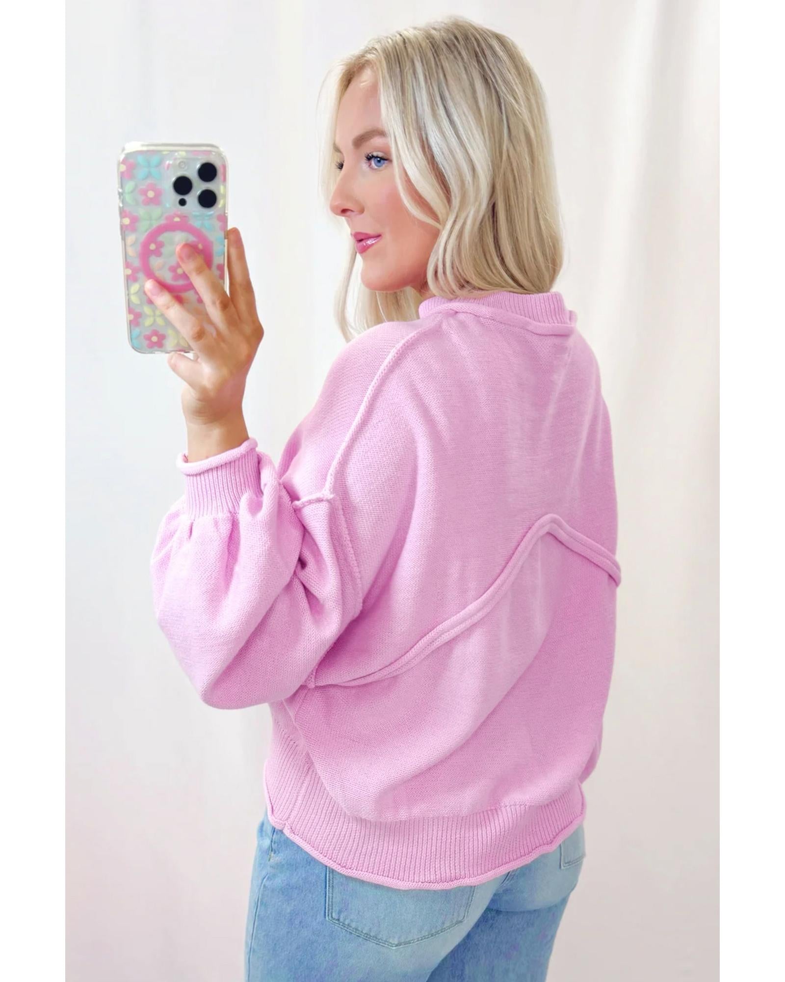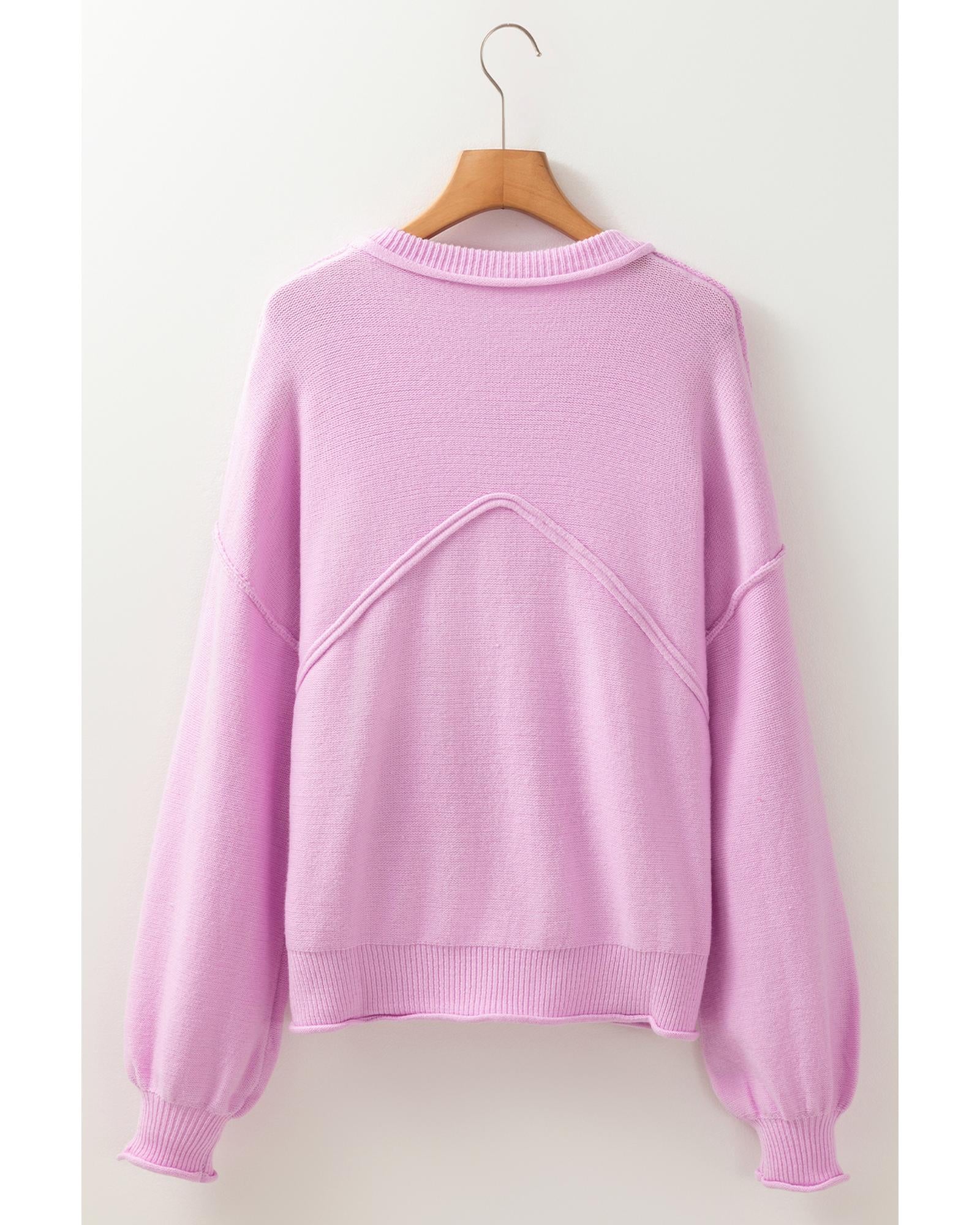 Pink Raw Edge Ribbed Detail Drop Shoulder Sweater - S