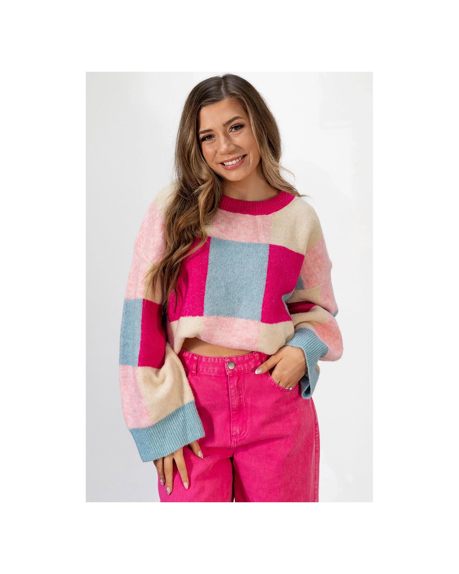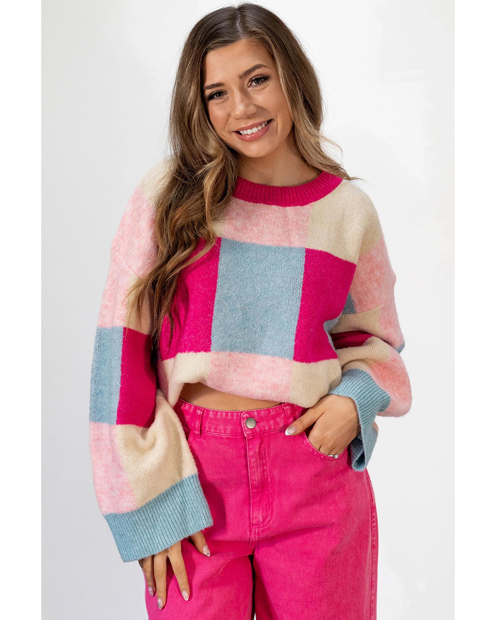 Rose Red Color Block Drop Shoulder Crewneck Loose Fit Sweater - XL