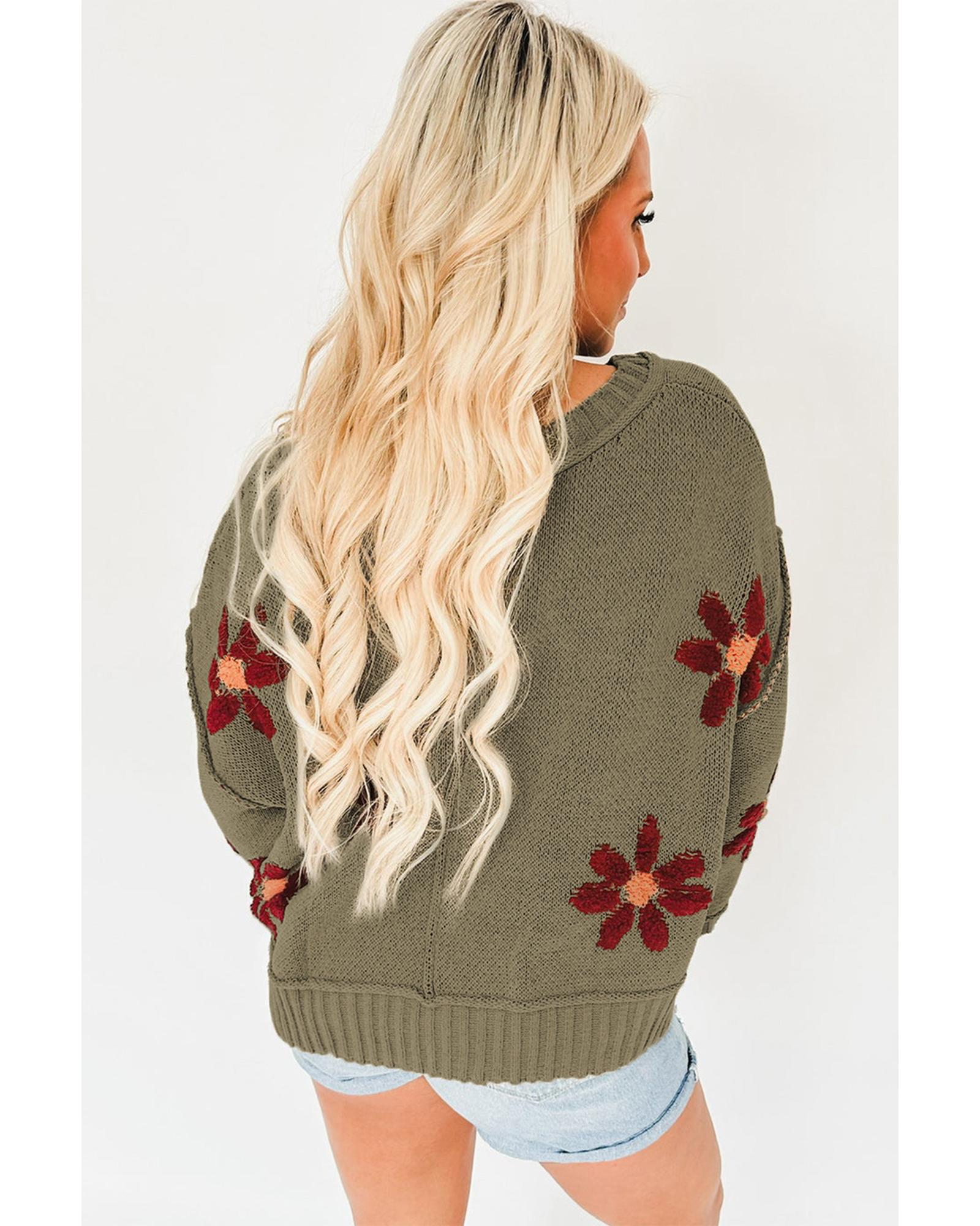 Sage Green Flower Knit Ribbed Trim V Neck Sweater - L